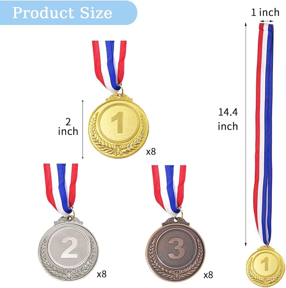 العبوة - سوف تحصل على 24 قطعة من ميداليات الجوائز، بما في ذلك 8 ميداليات ذهبية و8 ميداليات فضية و8 ميداليات برونزية، كل ميدالية بشريط.