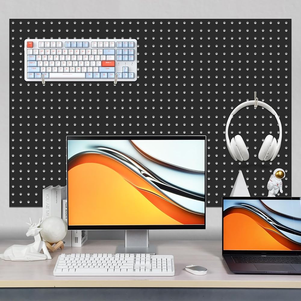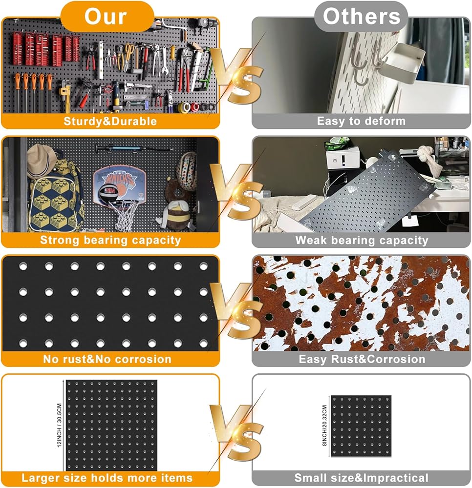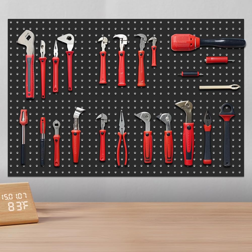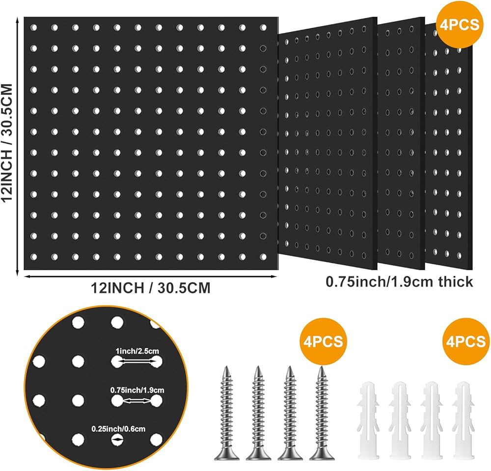 تصميم مثالي الحجم: يبلغ مقاس كل لوحة بيج بورد 30.48 × 30.48 سم مع فتحات قطرها 1/4 بوصة. يمكنك الجمع بين أربع قطع لإنشاء مساحات عرض أكبر تبلغ 24 بوصة × 24 بوصة أو 12 بوصة × 48 بوصة. أكبر من ألواح البيجبورد التقليدية، هذا التصميم يسمح لك بتخزين المزيد من العناصر، مع كل لوح بيجبورد يصل وزنه إلى 20 رطلاً!