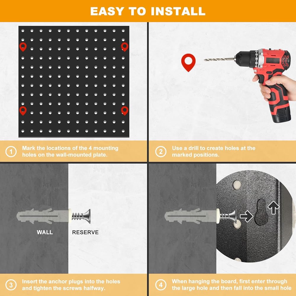إطار منحني لسهولة التركيب على الحائط: يتم طي جوانب لوحة المشابك الخاصة بنا لتوفير العمق، مما يسمح بسهولة التركيب المباشر على الحائط. هذه اللوحات المغطاة بطلاء المينا الأسود قوية بشكل لا يصدق، لذلك يمكنك تعليق أدوات الطاقة والأدوات اليدوية الأكثر قيمة لديك بثقة. لن تنحني هذه اللوحة أو تنثني تحت وزن الأدوات المتعددة، وهي تدعم الأوتاد السميكة والمتينة والسلال السلكية والمفاتيح والمثاقب بسهولة.