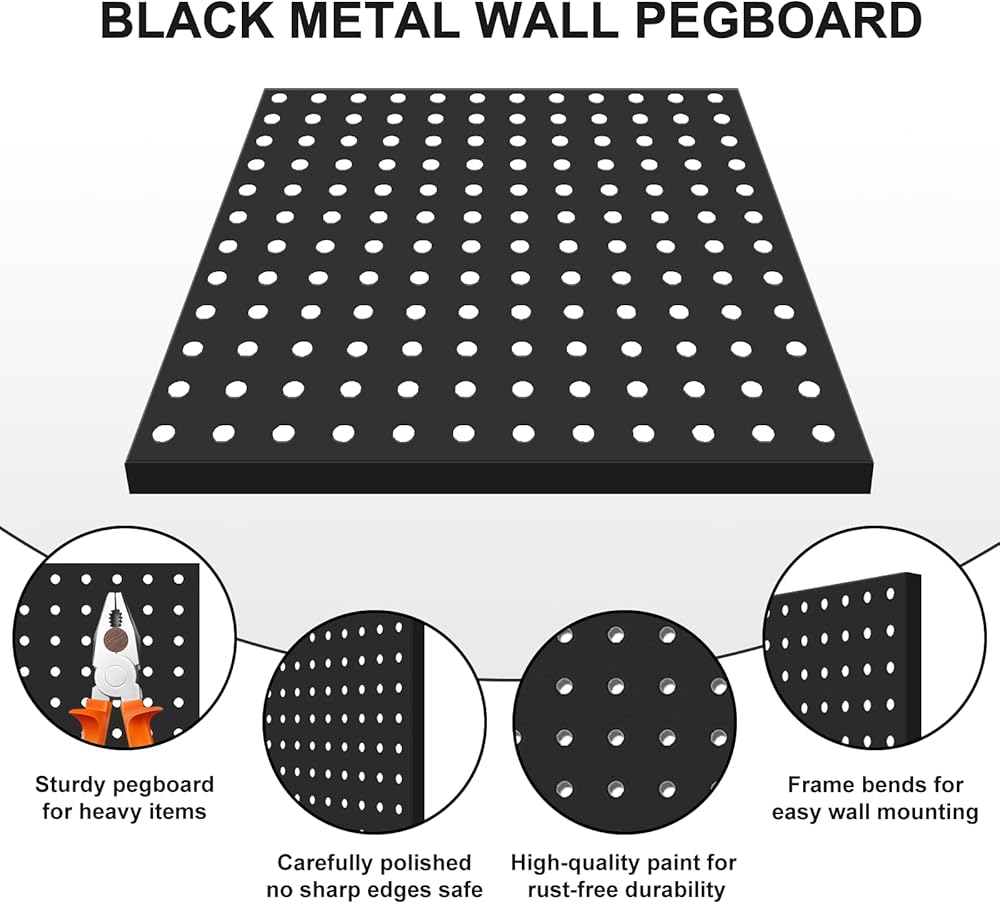لوحة بيجبورد معدنية شديدة التحمل: لوحة بيجبورد الخاصة بنا مصنوعة من معدن سميك ومتين يضمن قوة وطول عمر لا مثيل لهما. لا يبدو اللون الأسود الأنيق رائعًا فحسب، بل يكمل أيضًا أي ديكور منزلي. مع طلاء مسحوق قوي لمنع الصدأ والتشقق، توفر هذه اللوحة المعدنية قدرة تحميل وقوة 10 أضعاف مقارنة بألواح المشابك البلاستيكية التقليدية. إنه الخيار المثالي لغرفة الأدوات الخاصة بك، فهو قادر على حمل جميع الأدوات الخاصة بك دون أي عوائق - فلن يخيب ظنك!