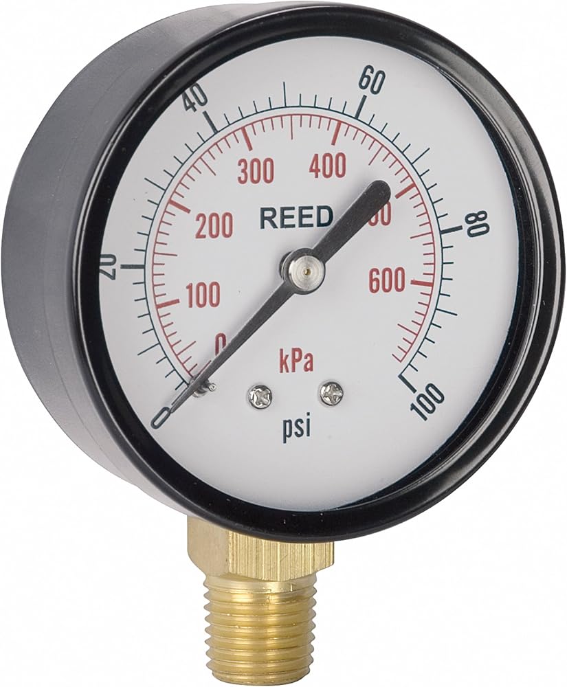 The REED pressure gauge has a 2.5" diameter dial and is rated for 20 to 60ºC and pressure steady at 75% ft.'s. It features a corrosion resistant stainless steel case and ring with an acrylic lens and brass internal materials.