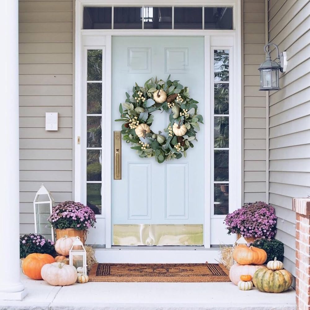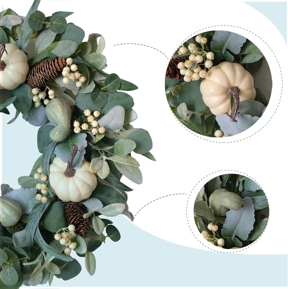 [Fall Door Wreath] This fall door wreath is made of eucalyptus, green pumpkin, white pumpkin, white berries, pinecones. The Combination of these classical fall elements makes the wreath life looking and real look. This wreath is a good choice for hanging on the doors for the coming season.