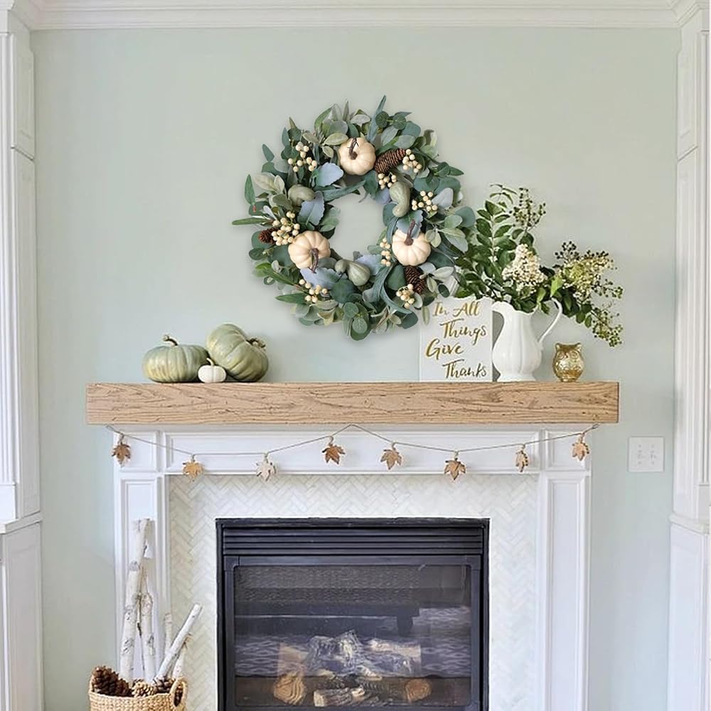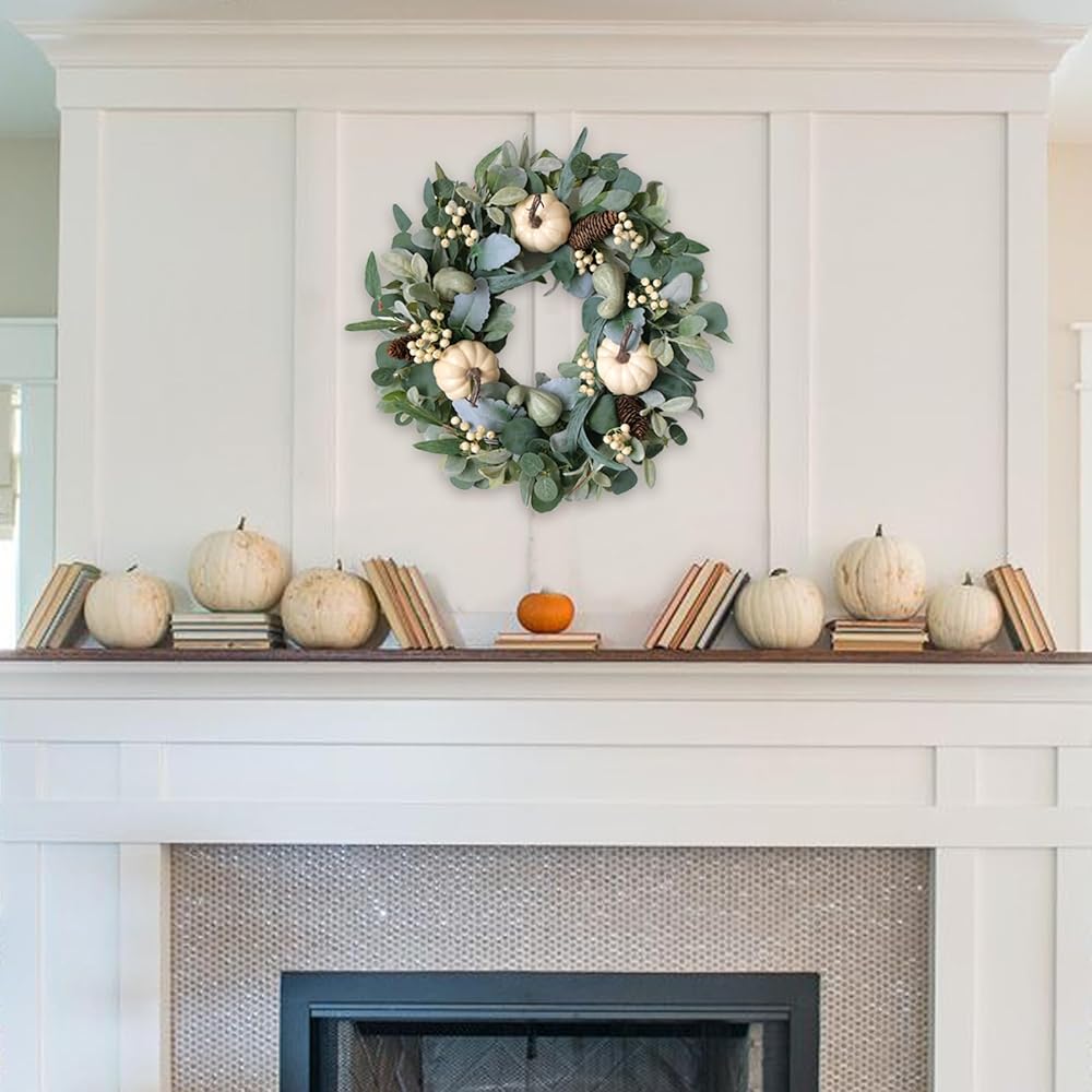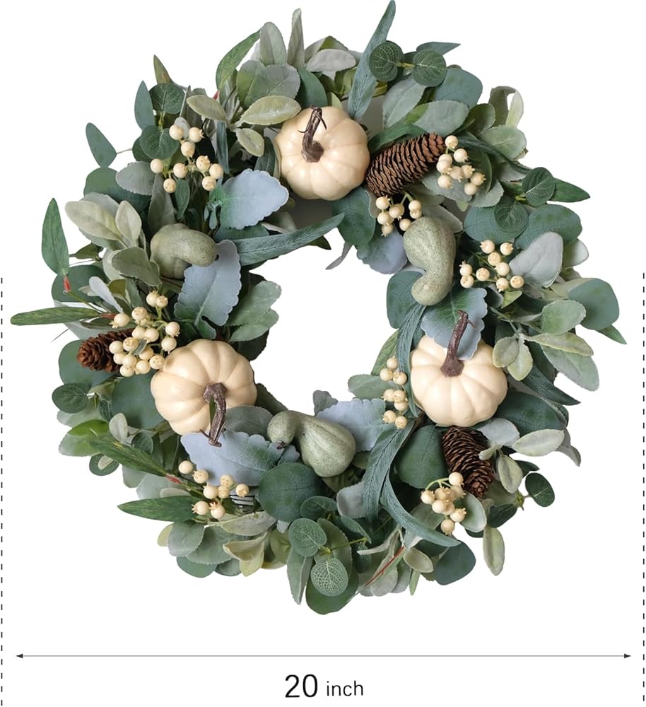 [18 Inch Pumpkin Wreath] The OUTER DIAMETER of this white green pumpkin indoor outdoor wreath is about 18 inches, this size is really suitable for who are seeking the large size and leafy full wreath for home decoration, such as hanging on the front door, back door, inside doors and decor your window and yards etc.