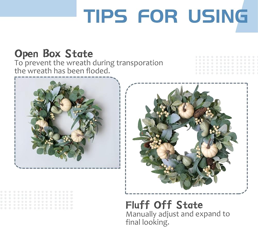 [Tips] 1.Fluff off the wreath to a perfect shape before hanging. 2.Please indoor use and covered outdoor use to keep the wreath long-lasting.
