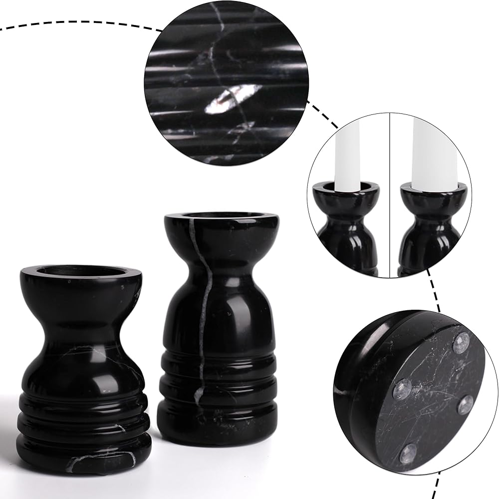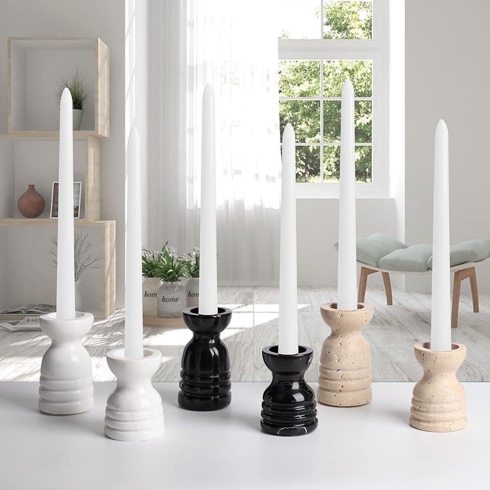Vintage & Minimalist: The minimalist style of a vintage natural castle. A set includes 2 marble candle holders designed for any standard 3/4 inch decorative candle holder or taper candle. Dimensions: Candle holders: Large: dia. 2.5" x 4.3", small: dia. 2.5" x 3.4". Candle hole: Large hole dia. 1.57", small hole dia. 0.82"