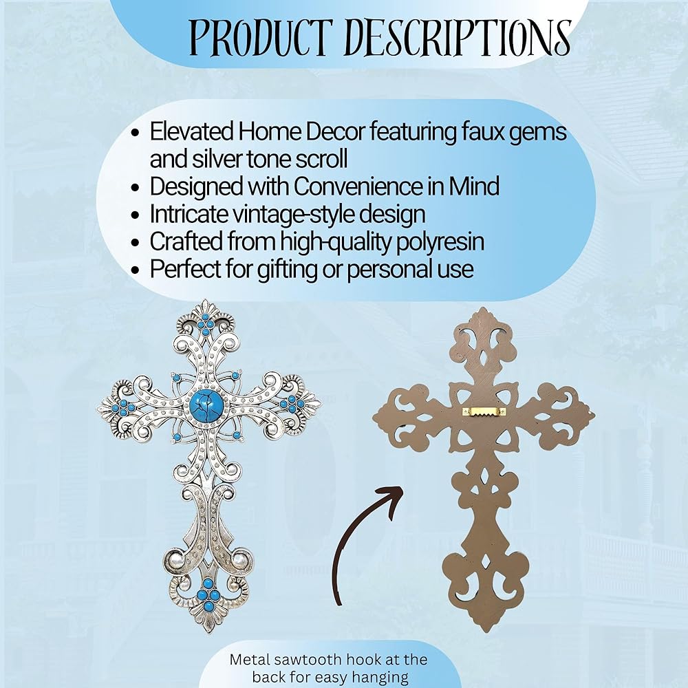 Add a touch of elegance and spirituality to your home with the BestGiftEver Decorative Wall Cross. This beautiful 13.4" x 9.25" x 1" wall cross, featuring turquoise faux gem accents and a silver tone scroll design, is perfect for enhancing any room's decor. Crafted from durable polyresin, this ornate cross is both lightweight and long-lasting, making it a perfect addition to your Christian wall decor or religious wall decor. The easy-to-use metal saw tooth hook at the back ensures simple and secure hanging, allowing you to effortlessly incorporate this piece into your spiritual home decor. Whether you're looking for a unique piece of Jesus wall art, a decorative cross wall art, or a spiritual wall cross to express your faith, this product meets all your needs. Its intricate design and stunning faux gem accents make it an eye-catching piece that adds charm and character to any space, from living rooms and bedrooms to offices. Perfect for religious celebrations or everyday decoration, this cross wall hanging is a thoughtful gift for loved ones or a beautiful addition to your own home. Its versatile style fits well with various home decor themes, including rustic, vintage, and contemporary. This Jesus wall sculpture not only serves as a religious symbol but also as a piece of art that brings a peaceful and spiritual ambiance to your surroundings. Enhance your home with this decorative wall cross and let it be a testament to your faith and aesthetic sense. Ideal for any occasion, this cross for wall is designed to inspire and uplift, transforming any room into a sanctuary of tranquility and devotion. Make this beautiful, spiritual wall cross a part of your home decor and enjoy the blend of faith and artistry it brings.