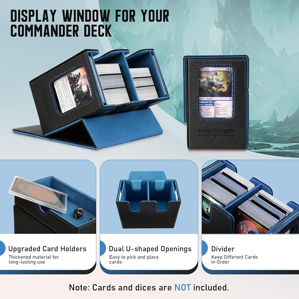 • نافذة عرض لسطح القائد الخاص بك: تم تخصيص صندوق سطح القائد mtg للاعبي قائد EDH. يمكنك تخزين بطاقات القائد/القائد الخاصة بك بشكل آمن في حاملات البطاقات المتضمنة. يتيح لك صندوق سطح mtg عرض شخصية القائد الخاصة بك من خلال النافذة، وسهولة رؤية السطح في كل صندوق بطاقات دون فتحه، وعرض مجموعتك بشكل أنيق.