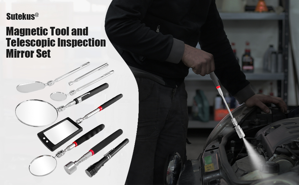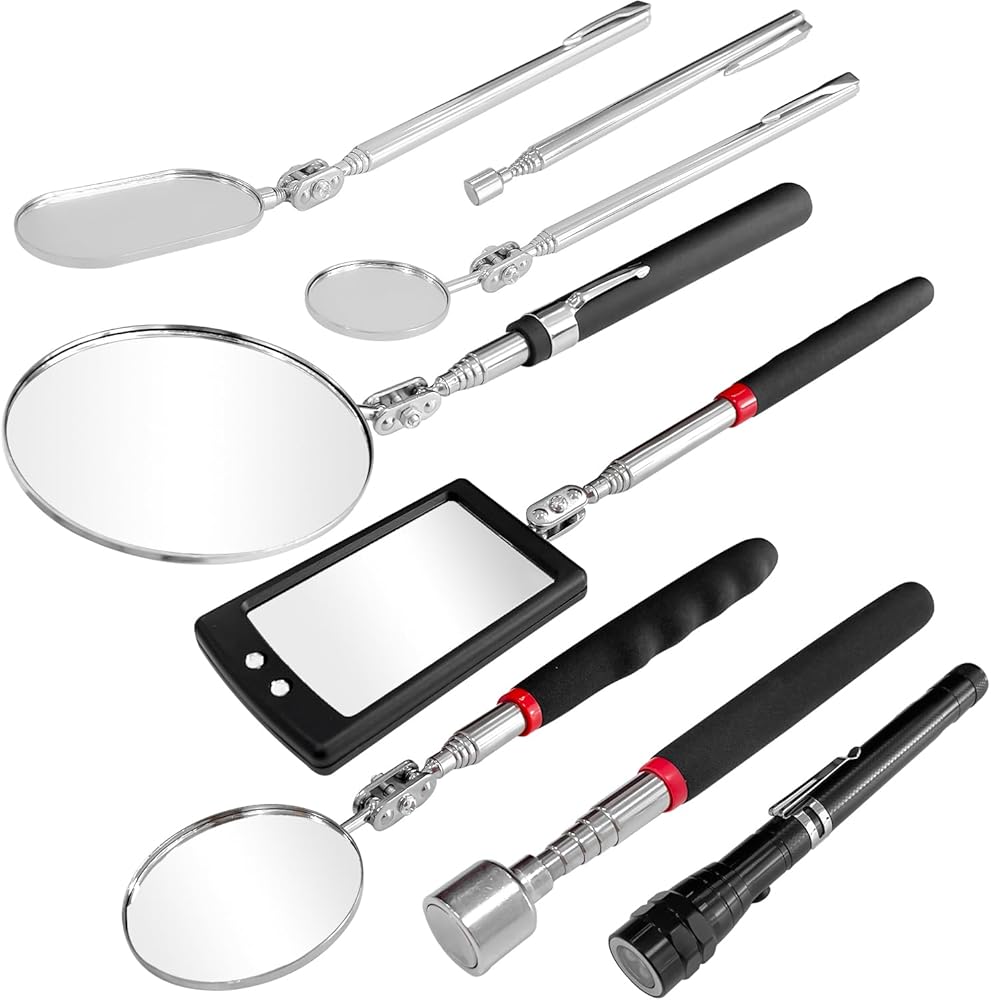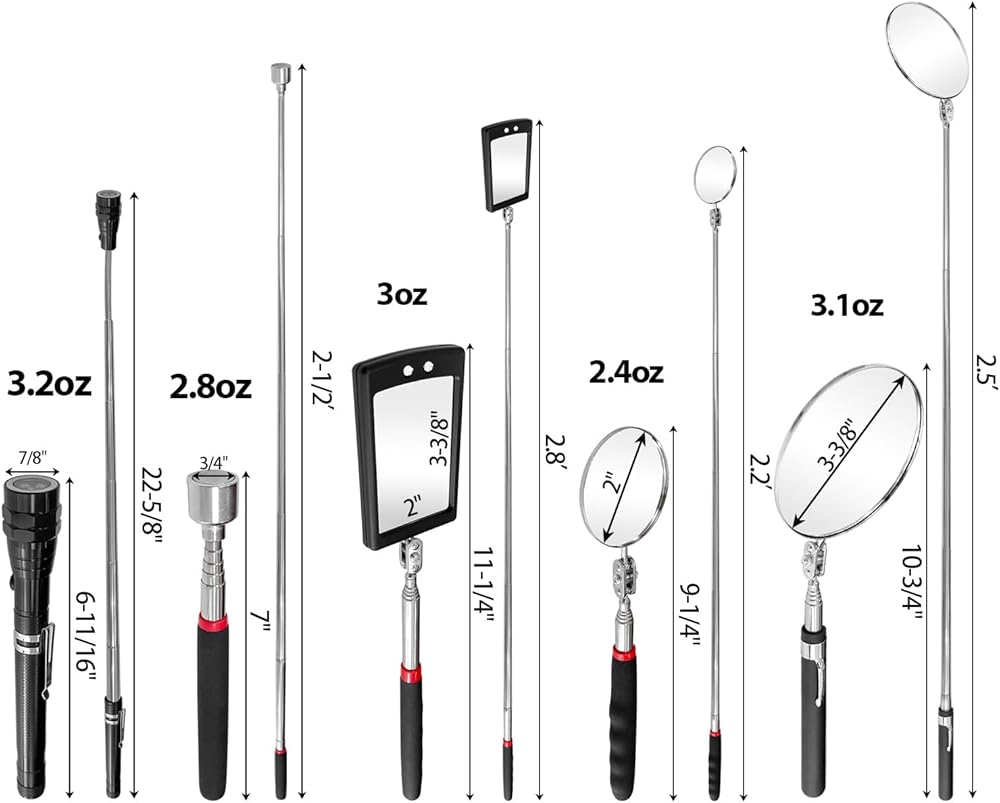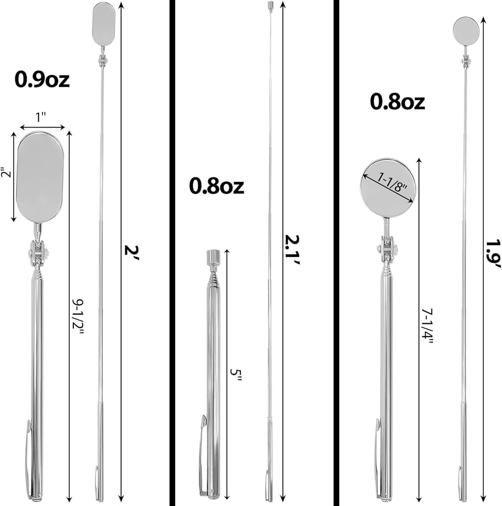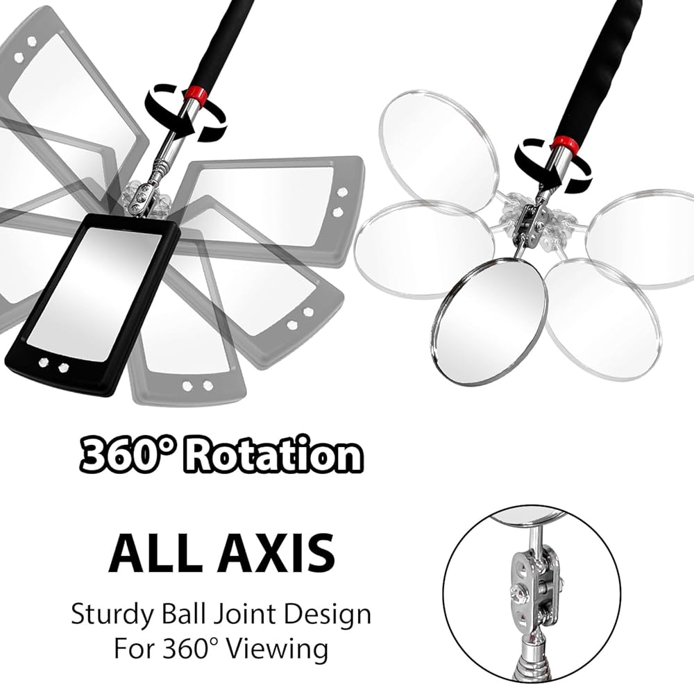 تحتوي مرآة الفحص على 5 مقاسات من المرايا للاختيار منها للمناسبات المختلفة. يمكنك تعديل الطول بمقابض تلسكوبية. تصميم دوار 360 درجة مناسب للمراقبة من أي زاوية.