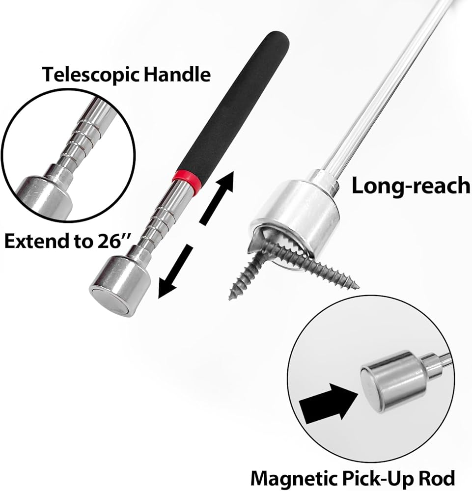 تم تصميم أداة المغناطيس القوية للمسح واستخدامها كأداة التقاط. المقبض المتداخل يجعل من السهل الوصول إلى الأماكن التي يصعب الوصول إليها. يمكنك العثور على واسترداد الصواميل المعدنية والمسامير والمسامير وما إلى ذلك بسهولة.