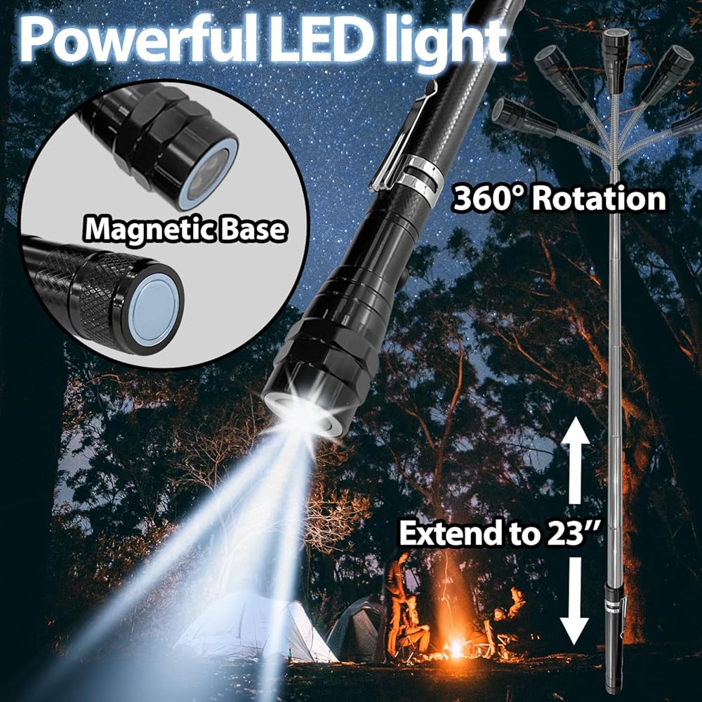 بفضل المقبض التلسكوبي والتصميم المرن على شكل رقبة معقوفة، يمكن لمصباح LED ضبط زاوية الإضاءة في الاتجاه الذي تحتاجه بشدة. القاعدة المغناطيسية تجعل من الممكن استخدامها أيضًا كأداة التقاط.