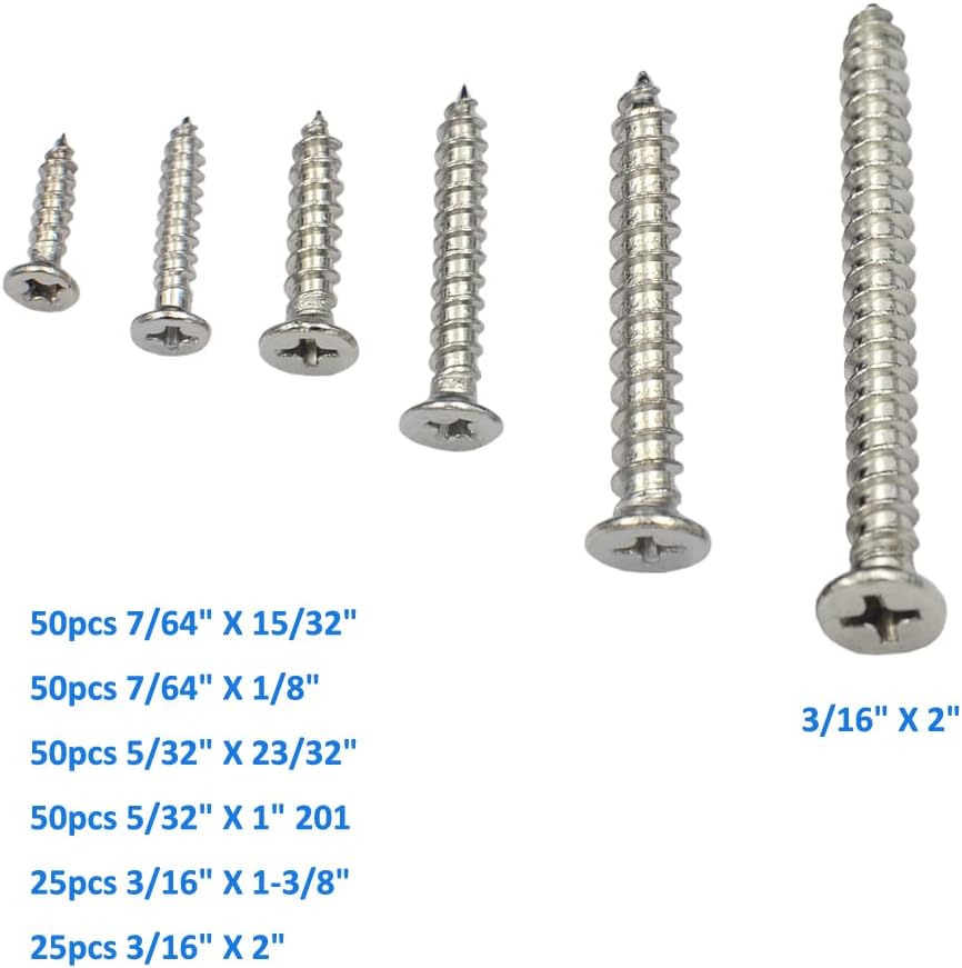 Total have 6 sizes screws, from small to big are: 7/64" X 15/32", 7/64" X 1/8", 5/32" X 23/32", 5/32" X 1", 3/16" X 1-3/8", 3/16" X 2"
