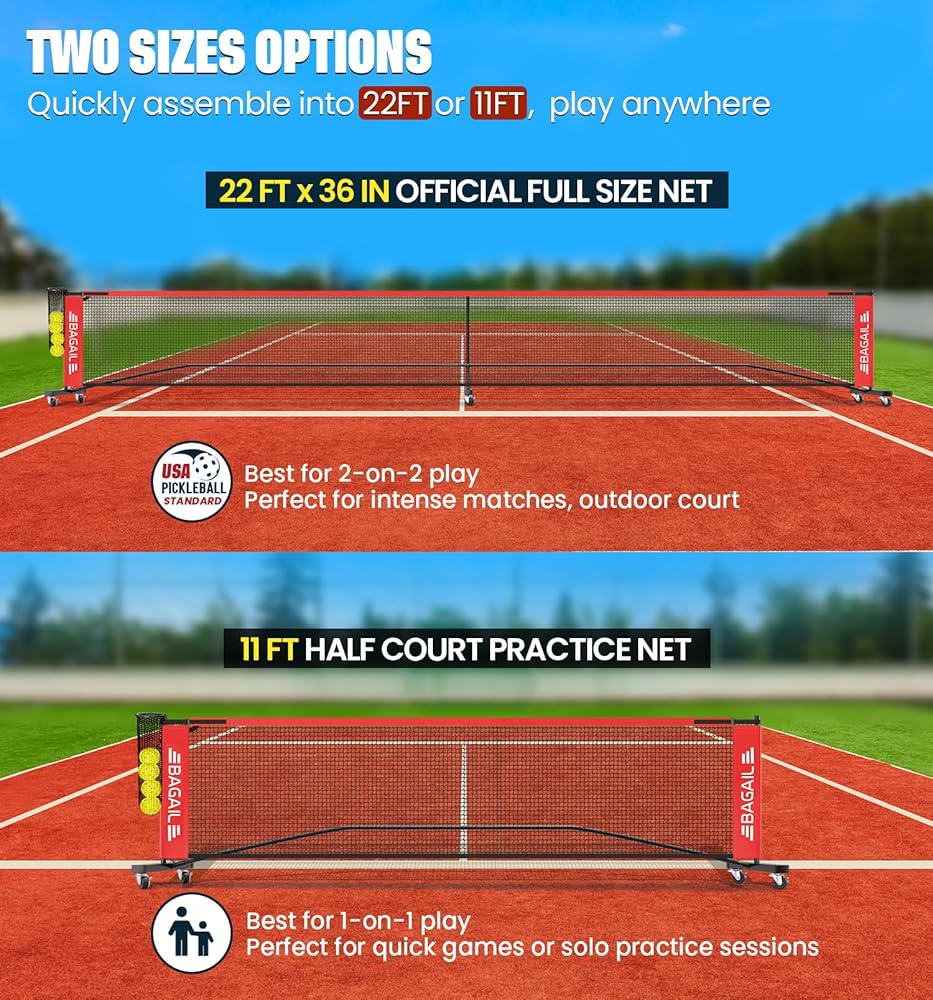 BAGAIL Portable Pickleball Net Set with Wheels, 22 FT Regulation Size & 11 FT Half Court Size 2-in-1 Pickle Ball Net with Ball Collector, Carry Bag, Easy Setup for Outdoor Indoor Driveway