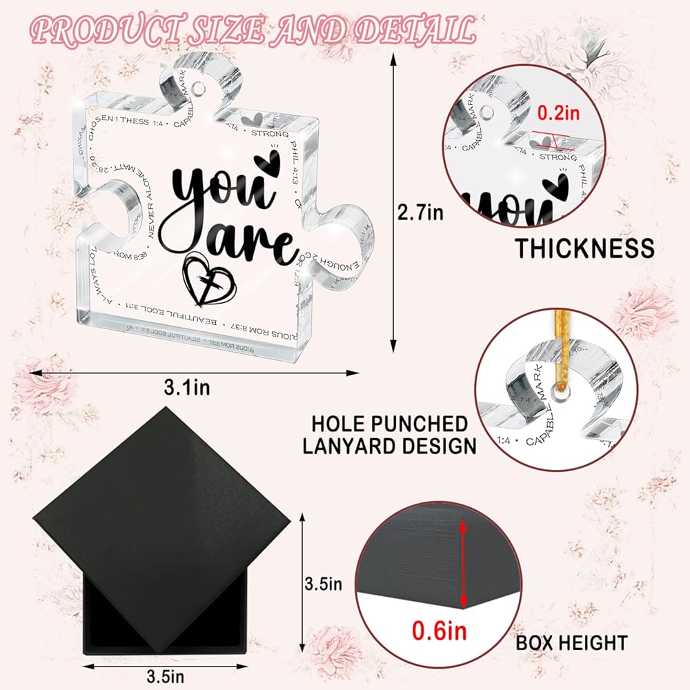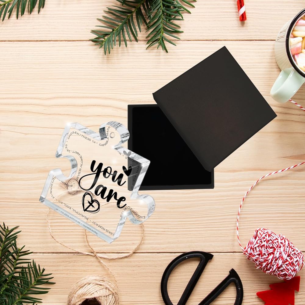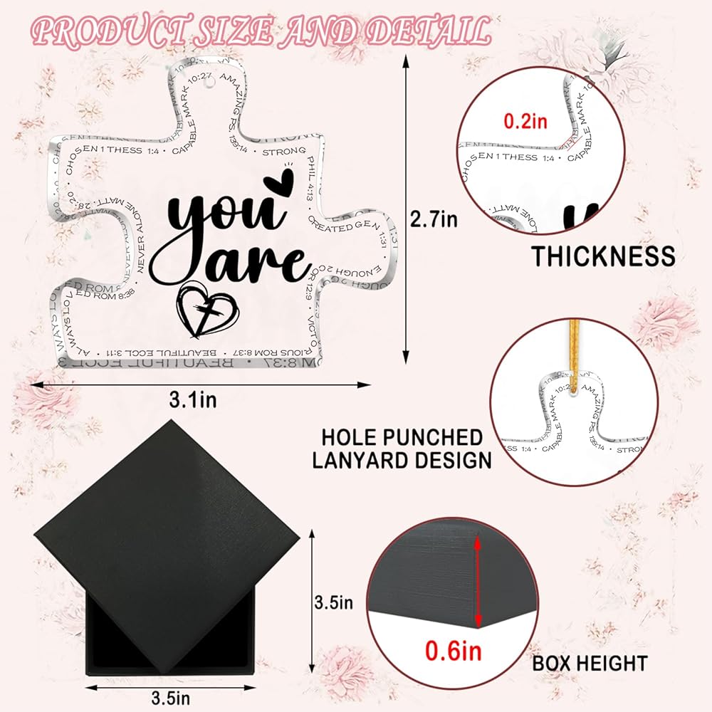 This clear acrylic Ornament puzzle 3.1"x2.7x0.2" inches, the perfect size without taking up too much space.Lightweight,no need for other support brackets.Suitable for different scenes or festivals, to your family, friends, colleagues