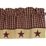 Create an enduring look with the Country Classic Wine Star Border Valance. Valance measures 60" x 14" and has a 2" header and a 2.5" rod pocket. Made from 100% cotton and lined. Priced and sold individually. Designed and manufactured exclusively for Primitive Home Decors. Dry Clean.