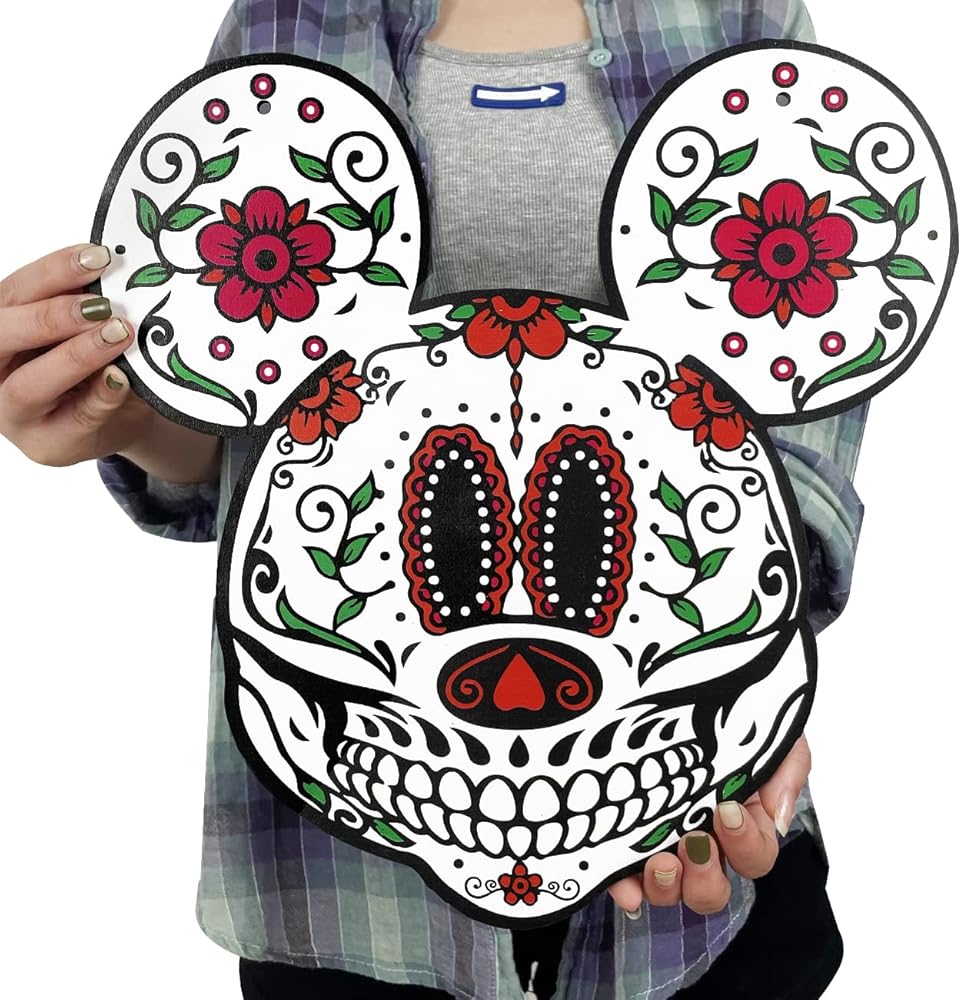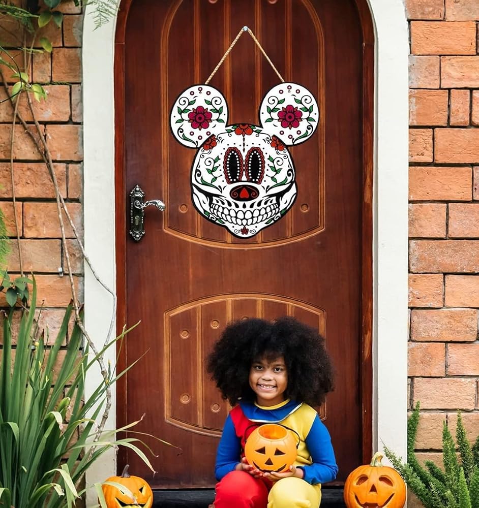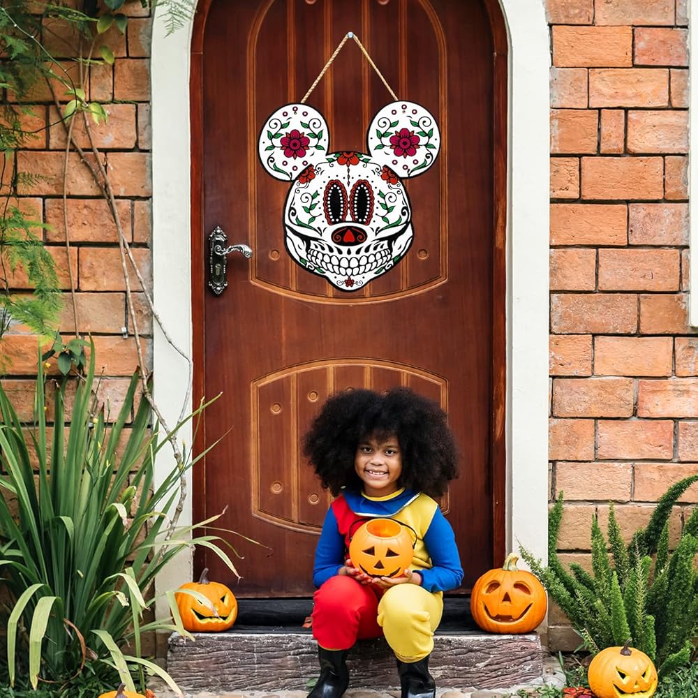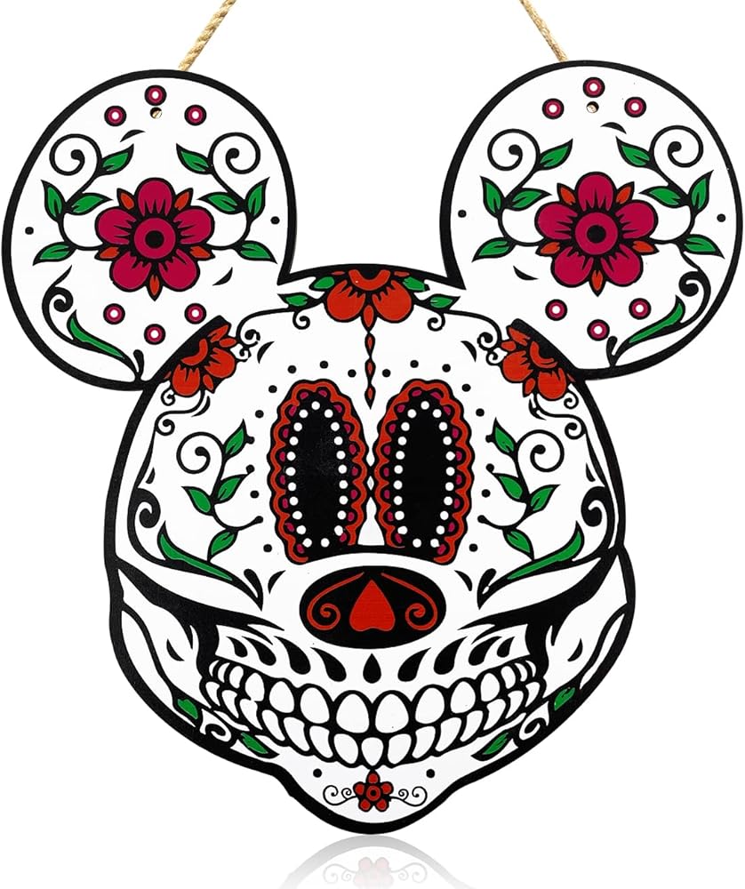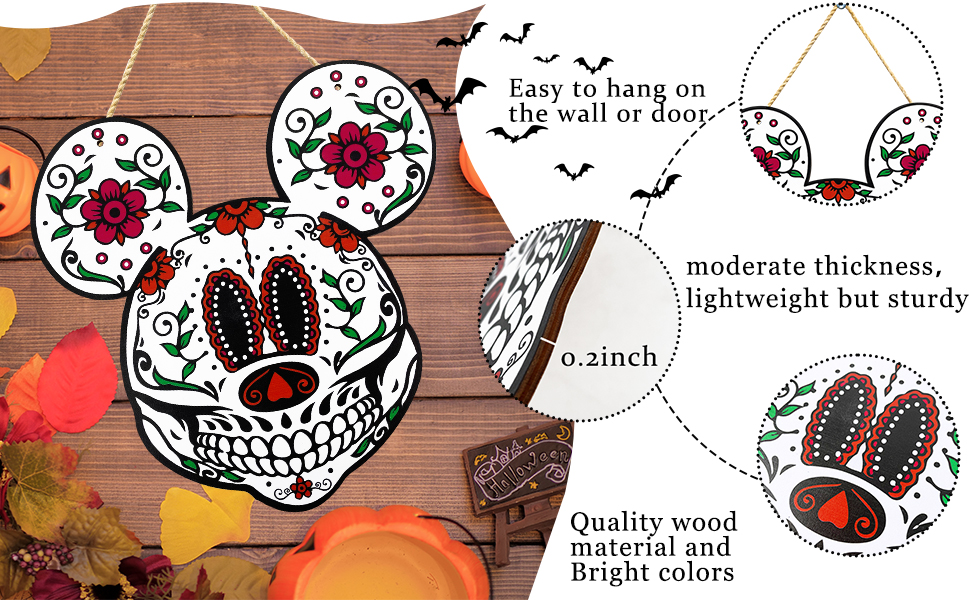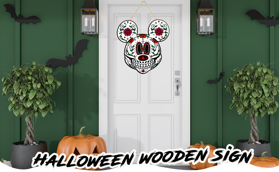 ديكورات فأر الهالوين، علامة خشبية يوم الموتى للباب الأمامي Dia De Los Muertos ديكور المكسيكي فييستا سكر جمجمة الزهور ديكورات معلقة على الحائط - علامة بوو الهالوين على شكل شبح الحلي