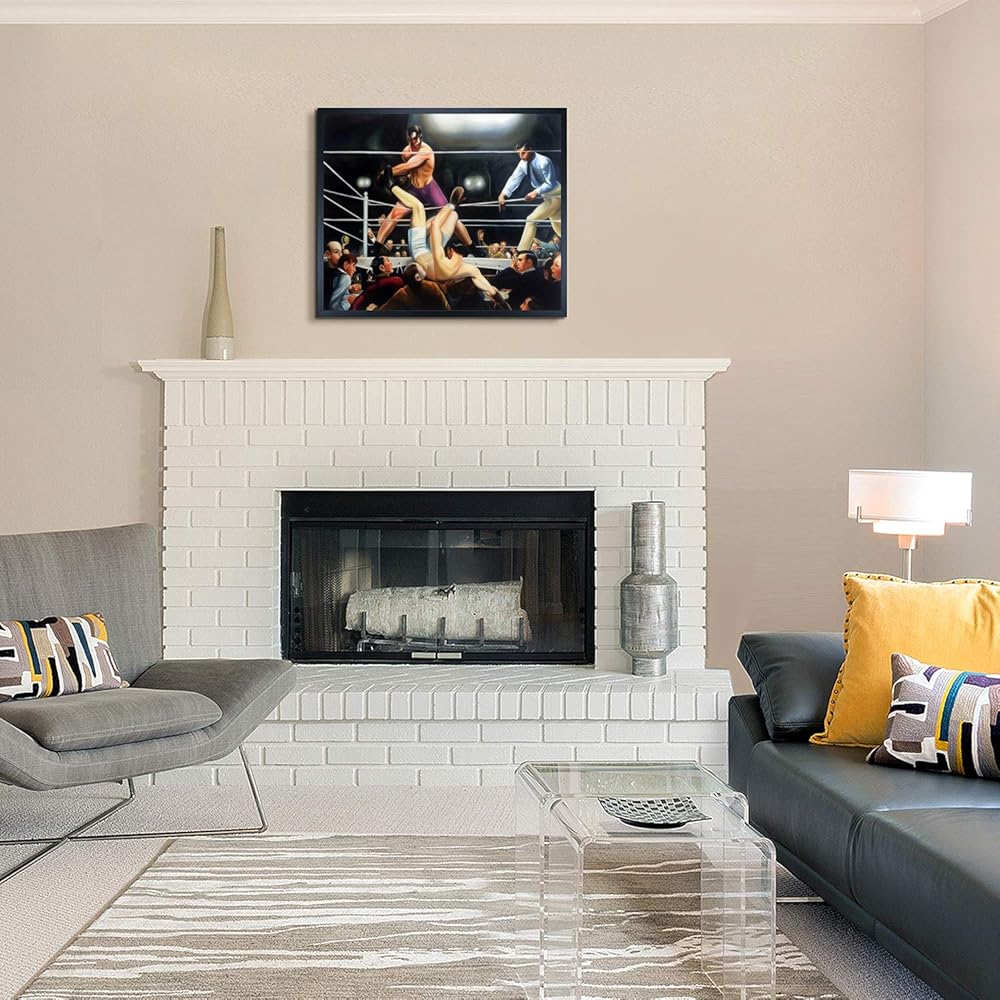 20" X 24" Oil Painting On Canvas A powerful re-telling of the fight for the 1923 heavyweight championship; George Wesley Bellows' Dempsey and Firpo reflects the ferocity with which the title is fought and won in this scene played out in his sensational painting. A true piece of American history taken from a live event will beautifully adorn any sportsman's home. "the most acclaimed American artists of his generation." Columbus Museum of Art George Wesley Bellows (1882-1925) was an American painter who lived and produced most of his work at the start of the twentieth century. Known for bold depictions of urban life in New York City, Bellows captures American pastimes based on his love of athletics. Bellows' style mixes dark atmospheres with bright light and geometrical shapes with long brushstrokes giving his scenes a sense of perpetual, fluid motion. These hallmarks of his style allowed Bellows to depict the grittiness of American society, a popular movement amongst turn-of-the-century realist artists. Although boxing scenes are Bellows' major contribution to art history, he later cultivates a more refined style and develops his use of light and dark to characterize the griminess of urban life fueled by the political and social themes of his time. Frame Description: Studio Black Wood Frame.