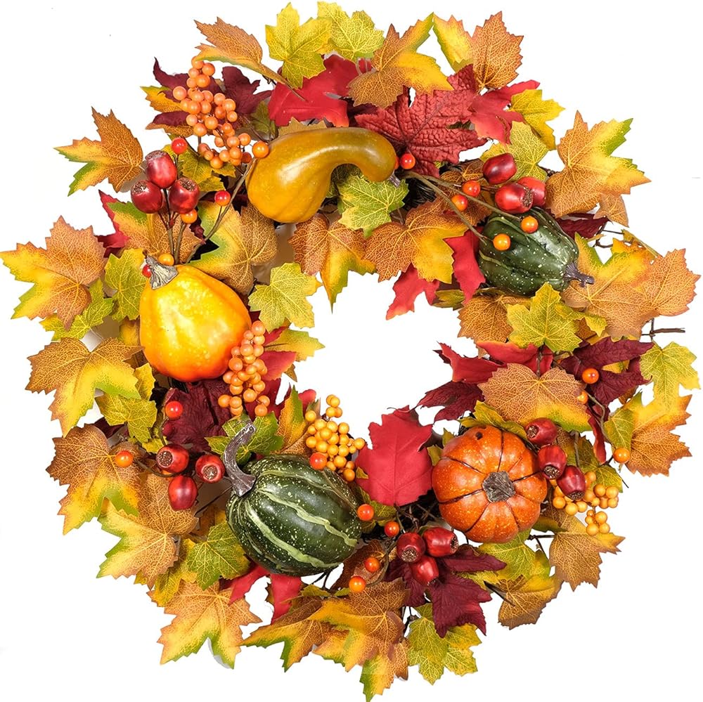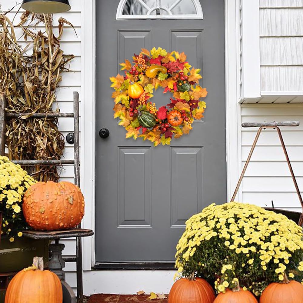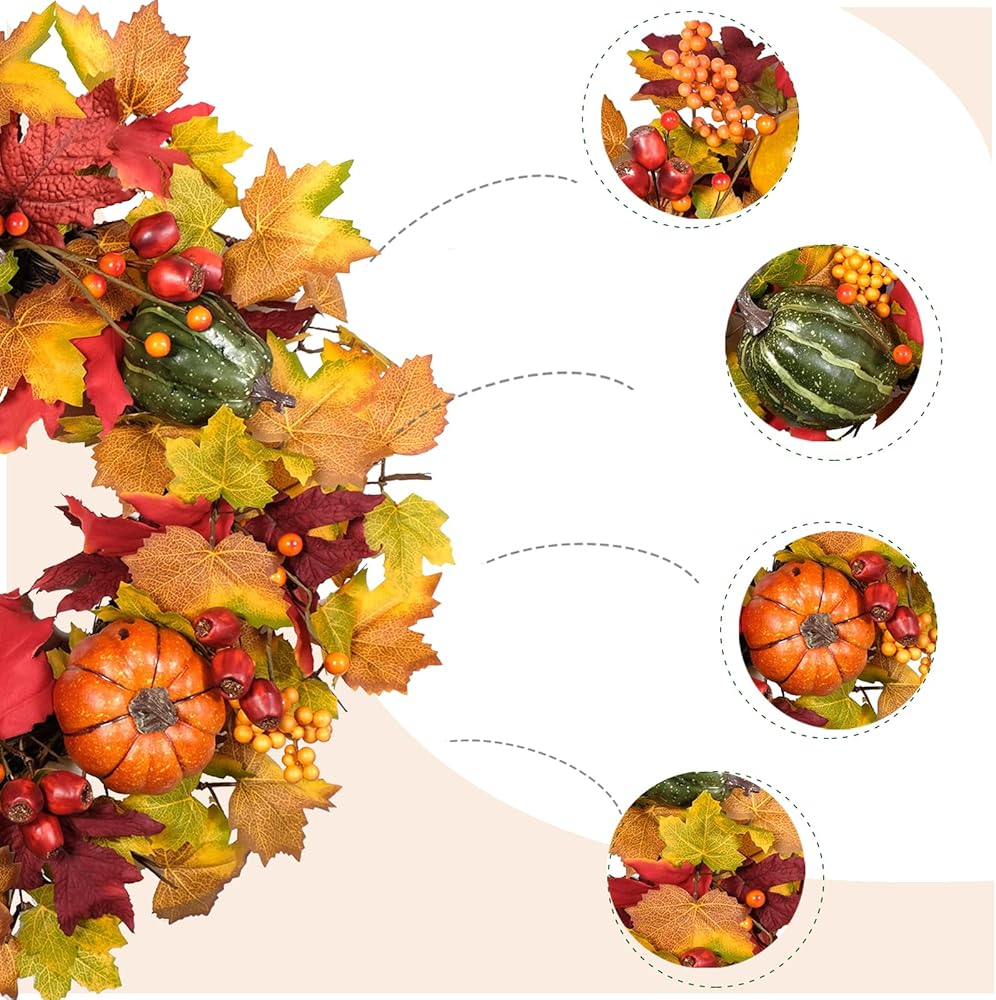 TEMPUS عيد الشكر إكليل سقوط أوراق القيقب إكليل أحمر أصفر التوت مع الأخضر البرتقالي الأصفر إكليل اليقطين للباب الأمامي مهرجان الحصاد نافذة الزفاف الخريف في الهواء الطلق ديكور داخلي
