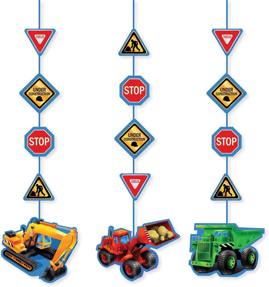 • Includes 3 decorations with assorted safety signs and an excavator, front loader or dump truck medallion accent