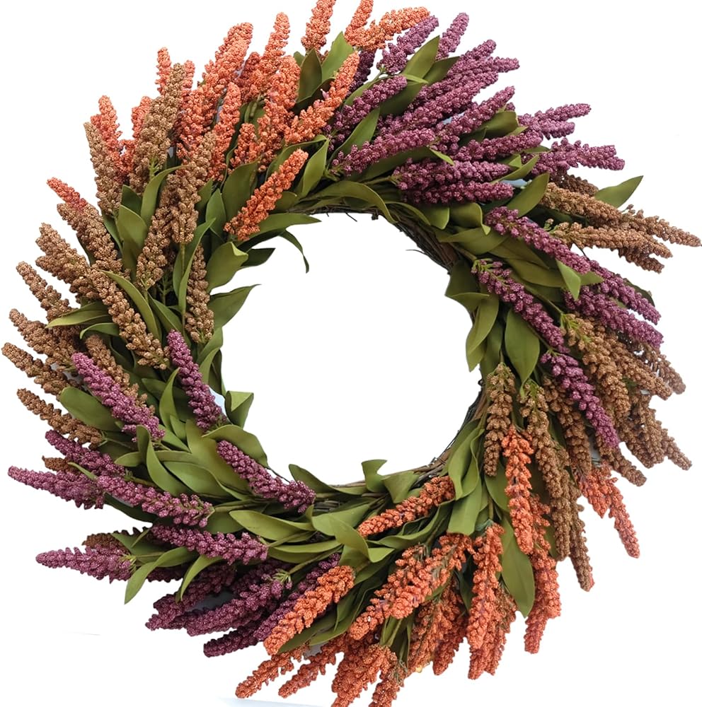 • 【High-quality Fall Wheat Wreath】The Wheat Autumn Wreath is made of Artificial wheat decoration and leaves. The base is durable natural grapevine with full of colourful grain, wheat, and natural leaves. The realistic wreath is vivid and vibrant.