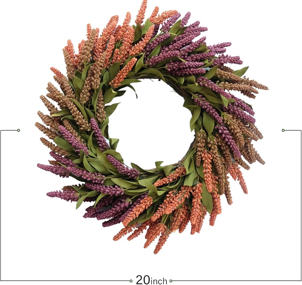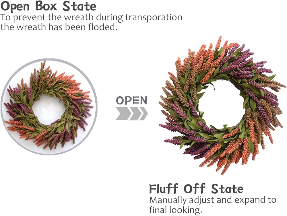 • 【Proper Size】 The 20" fall Wheat wreath may be squeezed during transportation. The size is actually measured after fluffing, they will reach the size as described. Please shape it according to our picture instruction before hanging.