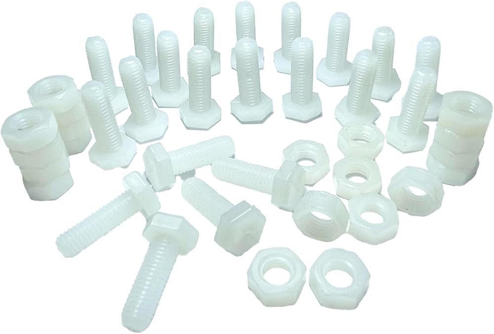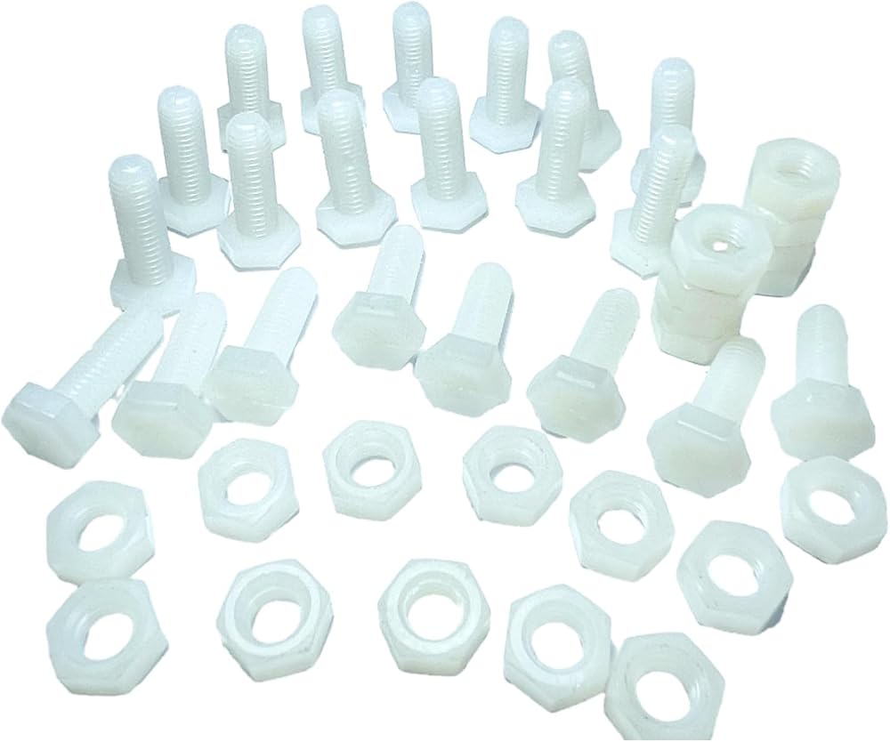 • 1 Package incldue:you will receive 20 pairs of White nylon Bolt screws and nuts. The Nylon screw thread size is M8 x 25mm, screw head height is 5.6mm, The nut is M8 thread.20 pairs hex head bolts with nylon nuts.