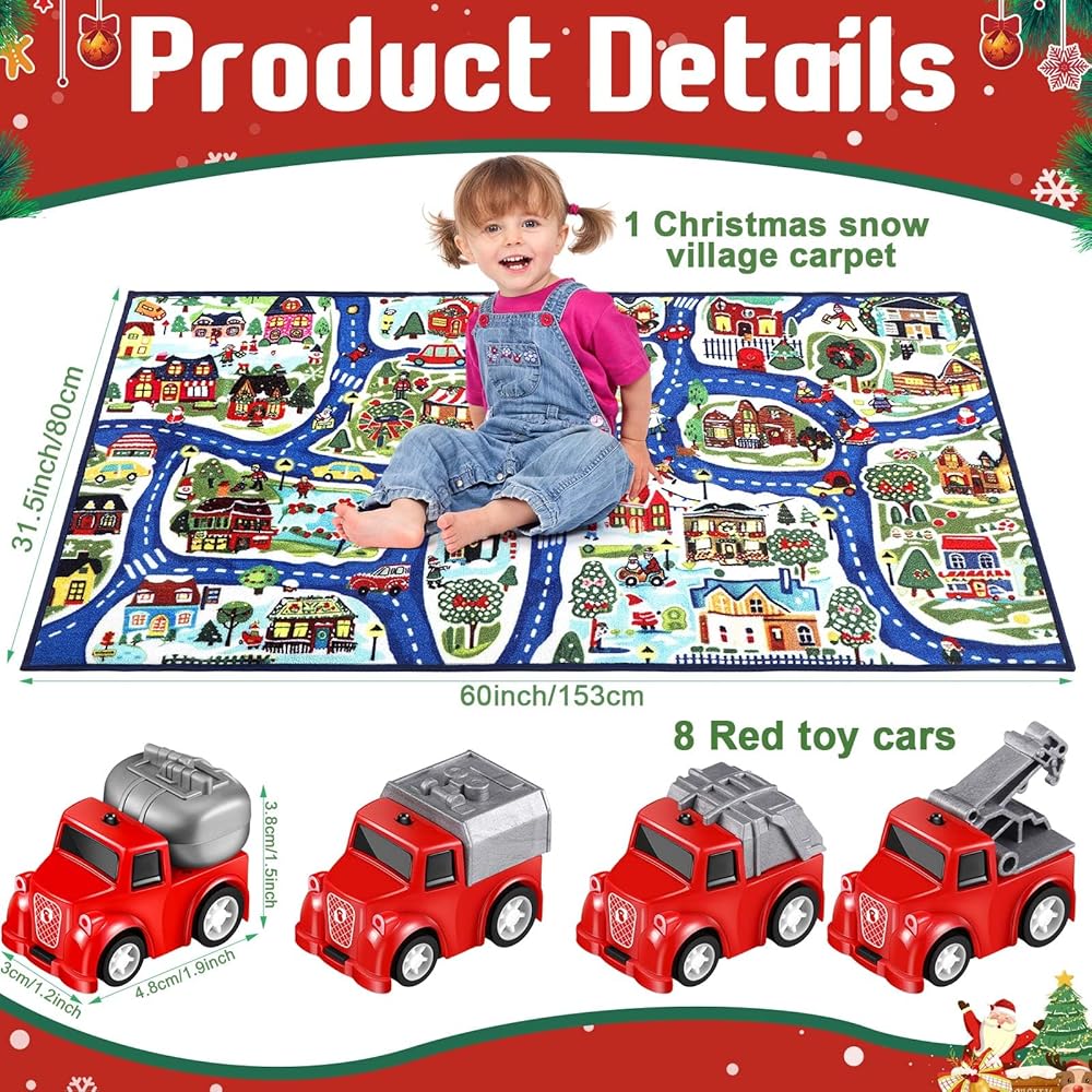 • What You'll Receive: 1 Christmas snow village carpet and 8 fun toy cars for endless amusement; An excellent combination for children's playtime