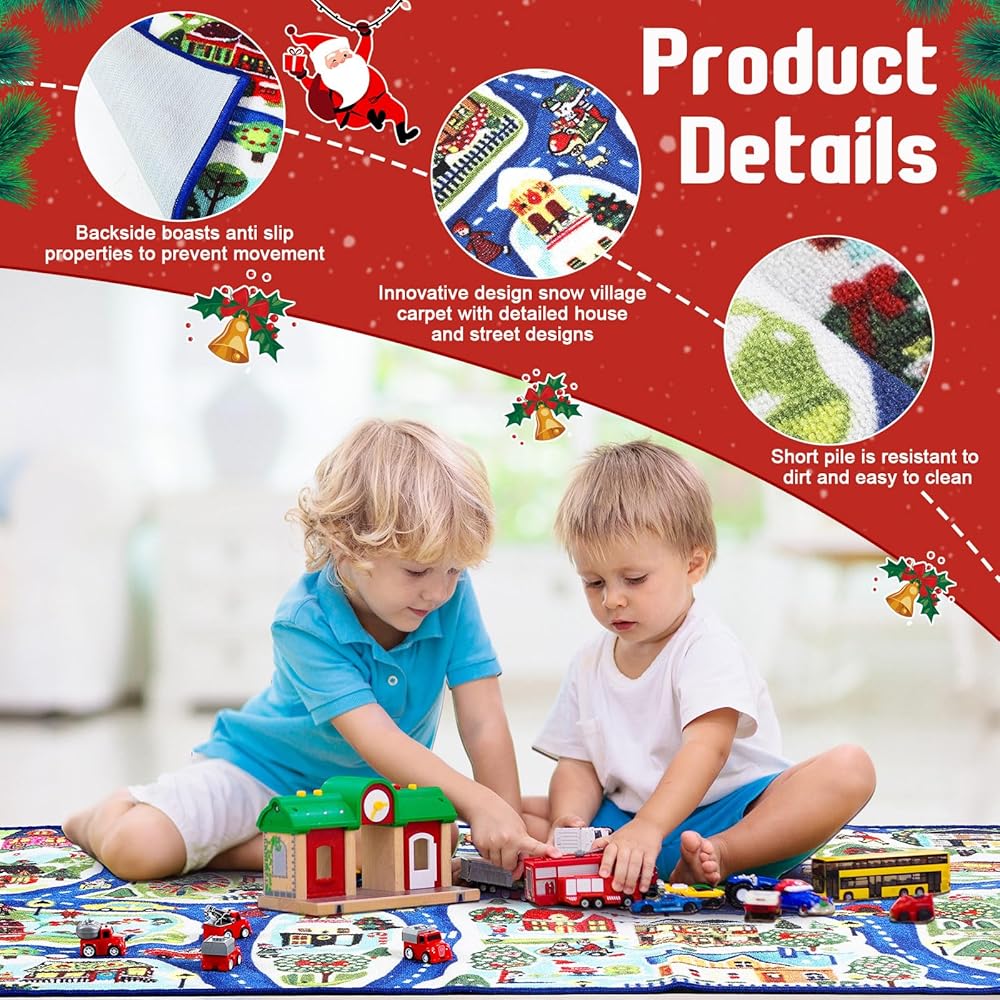 • Innovative Design: our snow village carpet is imprinted with detailed house and street designs which encourages your children to identify various characters and animals; This aids in the development of their imagination, expressive skills, motor skills, hand eye coordination, and narrative role playing capabilities
