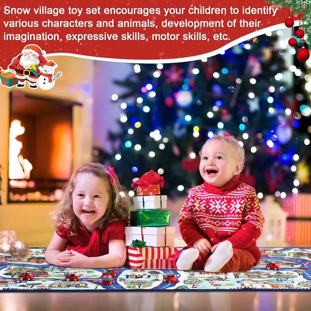 سجاد قرية الثلج لعيد الميلاد للأطفال مقاس 60 بوصة × 31.5 بوصة سجادة لعب للأطفال الصغار سجادة لعب مع 8 سيارات لعبة حمراء للمراهقين، هدية تعليمية ممتعة