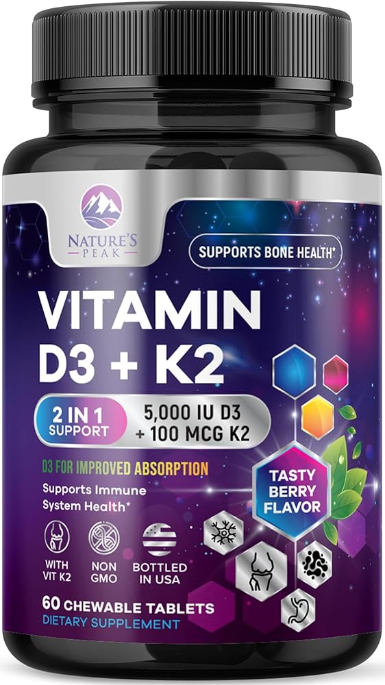 امتصاص أفضل: مزيج الطبيعة الفريد القابل للمضغ يعمل على تحسين امتصاص D3K2 لدعم صحة المناعة وامتصاص الكالسيوم والعضلات والأسنان والعظام والصحة العامة.