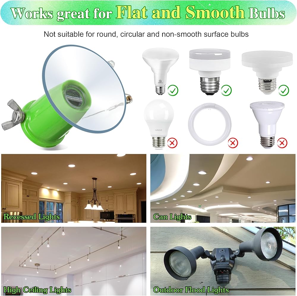 Suitable for mostly flat and smooth light bulbs such as recessed lights, canned lighting, track lighting, flood lights, LED light bulbs, high ceiling light bulbs and other indoor outdoor light bulb.
