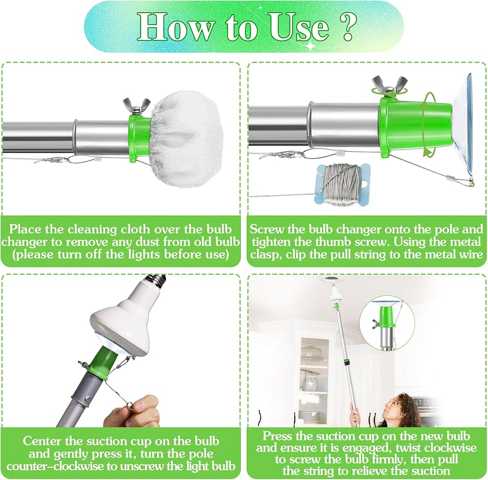 Suction Cup Light Bulb Changer Kit for High Ceilings with Pole, Angle Adapter and Microfiber Feather Duster