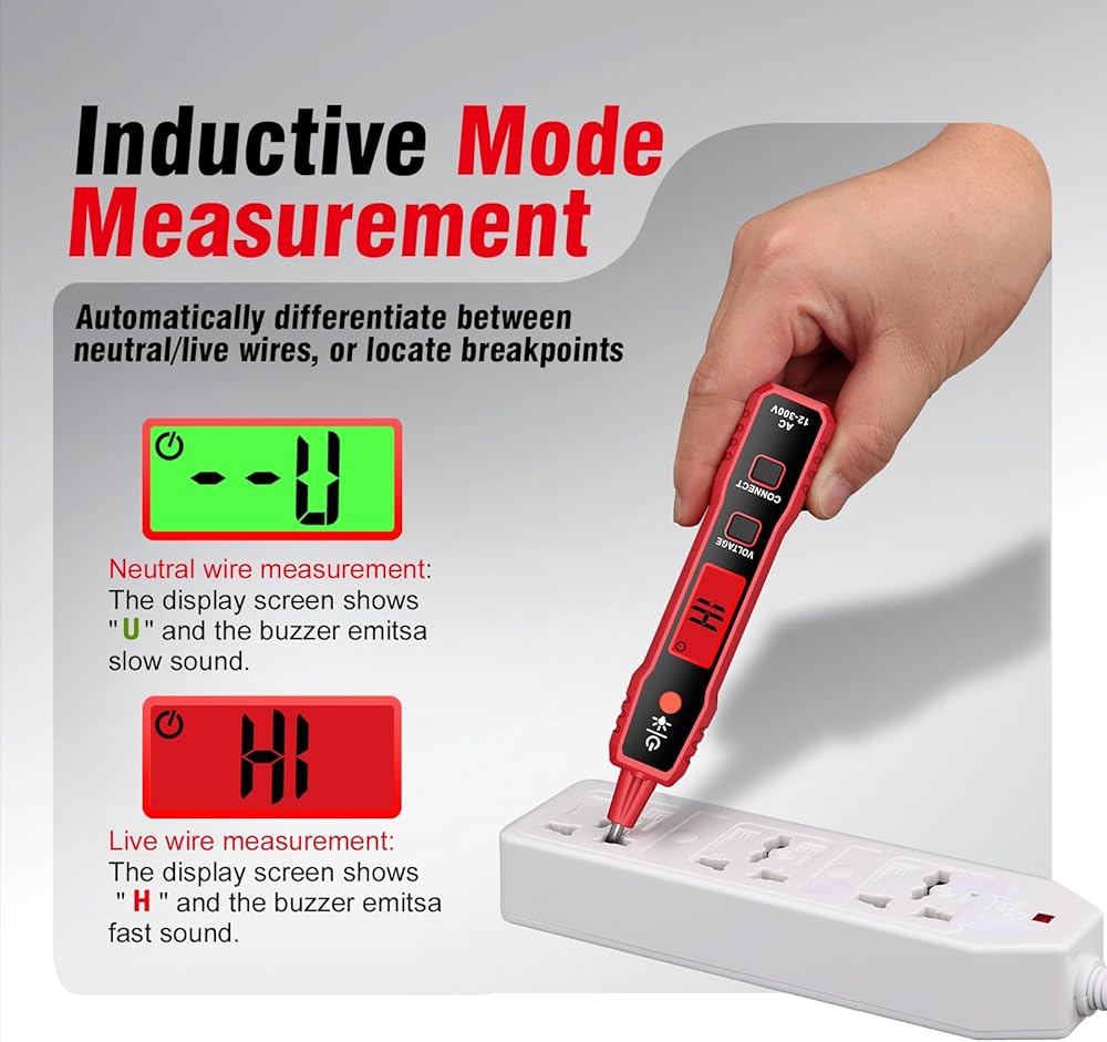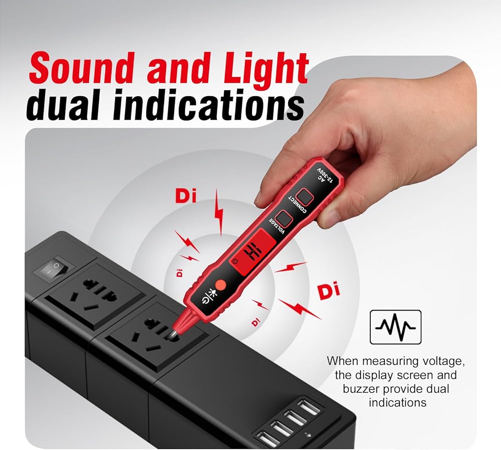 【نظام تنبيه مزدوج】يضمن المؤشر البصري لوجود الجهد الكهربي التعرف السريع والسهل، حتى في ظروف الإضاءة المنخفضة. يعمل التنبيه المسموع لاختبار السلك الحي/الصفر بمثابة طبقة إضافية من التأكيد، كما أن الجرس العالي والمتميز مفيد بشكل خاص في الضوضاء. البيئات. تضيء شاشة LCD الخاصة بجهاز اختبار الجهد الكهربي غير المتصل من الأخضر إلى الأحمر وتصدر صوتًا، ثم يمر تيار كهربائي مباشر من خلال المنفذ. إذا ظلت الشاشة خضراء، فهذا يعني أنه لا توجد طاقة ويكون العمل عليها آمنًا.