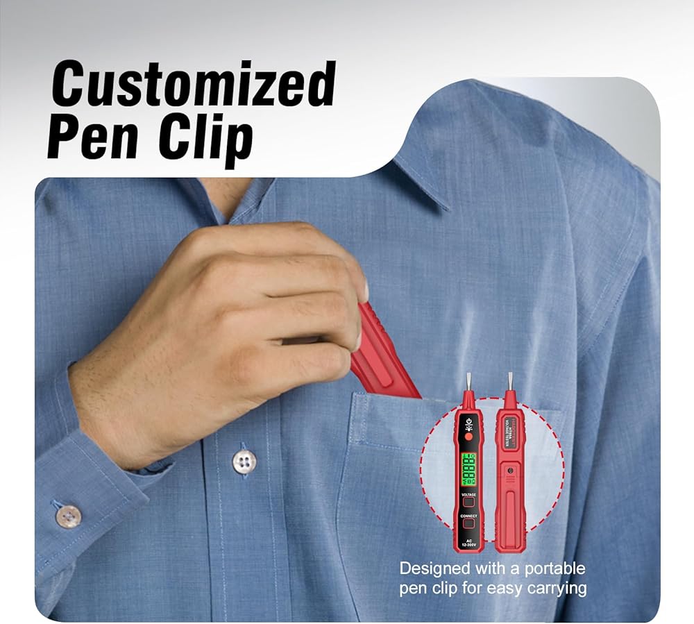 【إيقاف التشغيل التلقائي ومؤشر البطارية المنخفضة】يأتي جهاز اختبار الجهد الكهربي مزودًا ببطارية واحدة، ويعمل مباشرة خارج الصندوق. بعد حوالي 3 دقائق من عدم النشاط وعدم اكتشاف إشارة، سيتم إيقاف تشغيل جهاز الاختبار الكهربائي تلقائيًا لإطالة عمر البطارية. جهد البطارية أقل من 2.5 فولت، وستعرض الشاشة رمز انخفاض البطارية. مصباح يدوي LED ساطع للعمل في الأماكن الخافتة، بحجم الجيب، يسمح لك خطاف القلم بحمله في جيب قميصك.