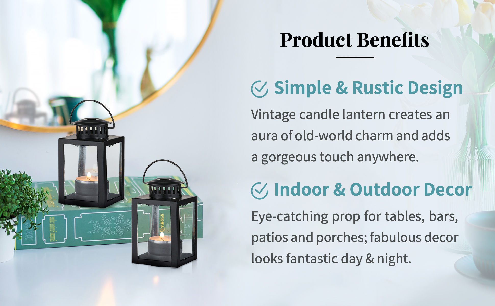 تصميم عتيق: مزيج رائع من الجمال والعملية يضيف لمسة رائعة في أي مكان، فانوس الشموع المزخرف العتيق يخلق هالة من سحر العالم القديم. دعامة لافتة للنظر للطاولات والحانات والباحات والشرفات.