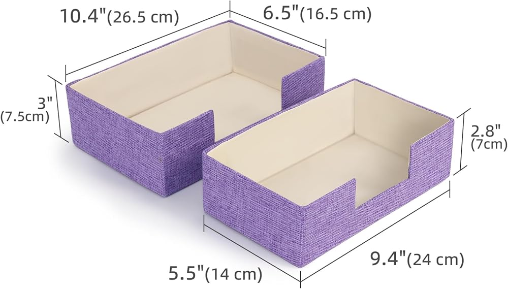 تفاصيل عبوتين من حامل المناديل: تحتوي هذه المجموعة على سلتين بحجم التعشيش. مقاس السلة الكبيرة 10.4x6.5x3 بوصة/26.5x16.5x7.5 سم، بينما يبلغ مقاس السلة الصغيرة 9.4x5.5x2.8 بوصة/24x14x7 سم، مما يجعلها مثالية للحفاظ على مجموعة من المناديل ذات الحجم القياسي منظمة. يتيح لك تصميم التعشيش توفير المساحة عندما لا تكون السلال قيد الاستخدام.