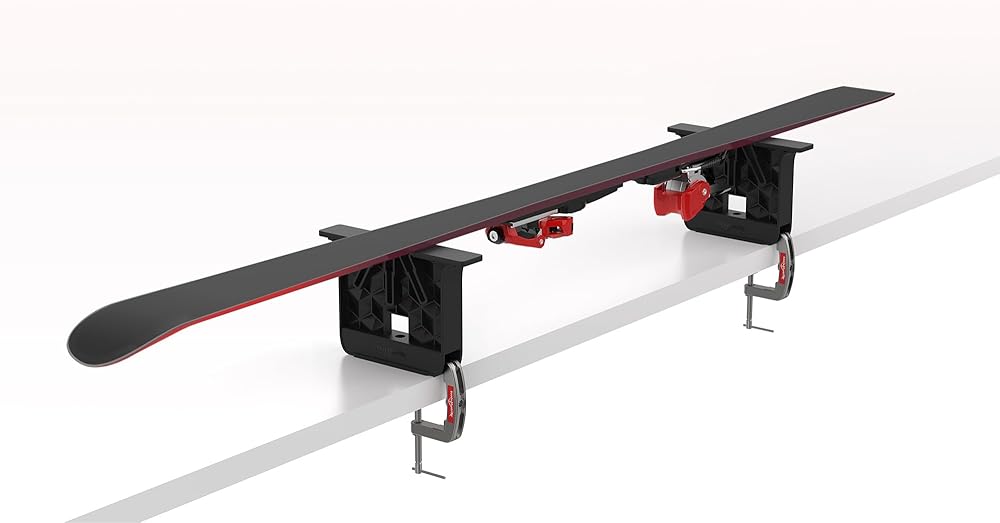 New for 2024 Tools4Boards Compact Waxing & Tuning Vises make it easy to properly prep skis and snowboards for a more enjoyable ride. 10 x 7 x 3" (254 x 178 x 76 mm) dimensions easily fits in Tools4Boards Zippered Bag or wax box. Extra-wide platforms fully support two of even the widest skis, or any size snowboard. Soft, durable Alcryn® melt-processible rubber pads are molded onto a lightweight, impact-resistant Lexan® polycarbonate frame to maximize friction for unprecedented grip when cleaning, waxing and brushing. Includes center bridge rubber pads/ kid's ski adapters. Side edge slots position ski or snowboard at 60°, 90° or 120° depending on user preference. Dual-width slots – ski is placed in wider, upper portion of slot for unobstructed edge access, while snowboard drops down into narrow lower portion for increased stability. For a more secure hold simply slide supports towards each other to wedge ski or snowboard in slots. Isotropic plate-lattice (one of the strongest structures known) provides rock-solid stiffness with thin wall sections reducing the amount of material used. 6 ¾” (171 mm) height provides ample clearance for all bindings. Use Fix metal c-clamps (provided) to securely fasten supports to any tabletop with a thickness of 2 ½" (635 mm) or less, or use any length 6" (150 mm) bar clamp (sold separately) for thicker tabletops. Compatible with Tools4Boards Lightning Stand, Lite Stand or Tool Mount Rail for quick length adjustment using T-bolts with adjustable knobs (sold separately) for quick length adjustment.