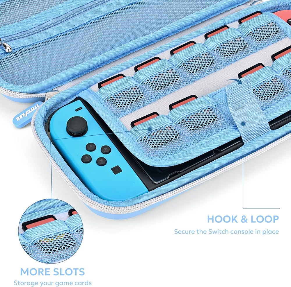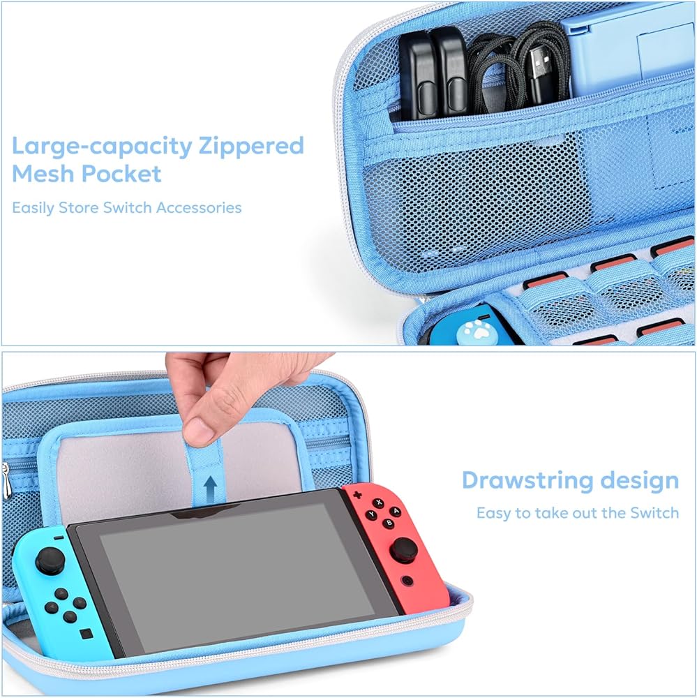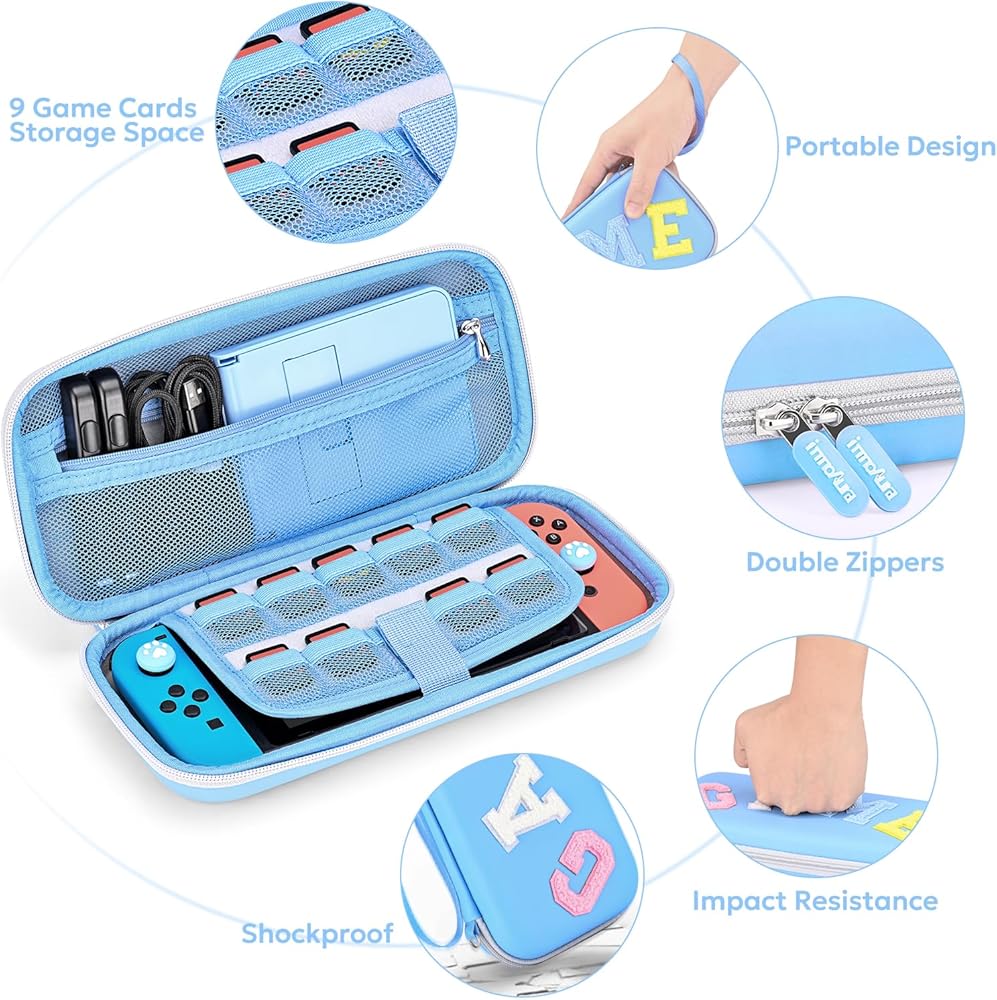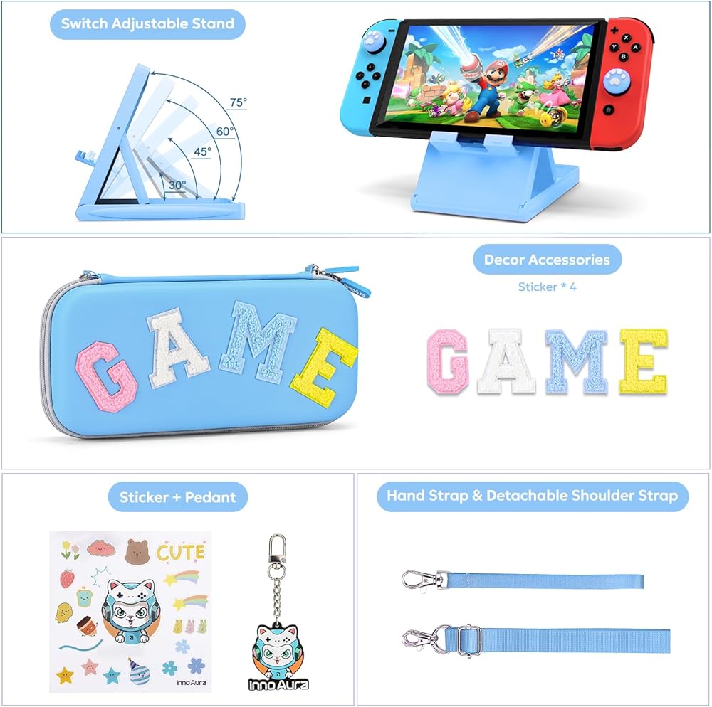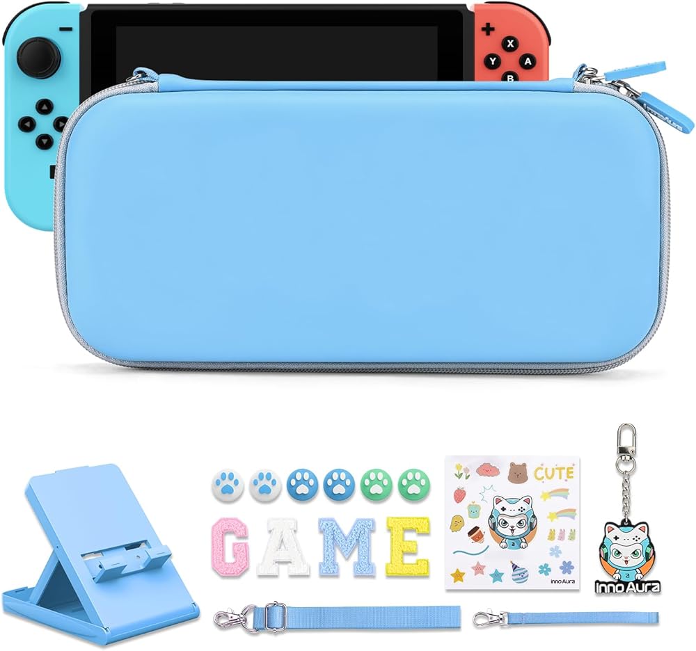 حافظة innoAura Switch/OLED لـ NS، حزم ملحقات التبديل 16 في 1 مع حقيبة حمل المفتاح، حقيبة ألعاب التبديل، حافظة حماية التبديل، حامل التبديل، أغطية إبهام التبديل (ربط أزرق رمادي)