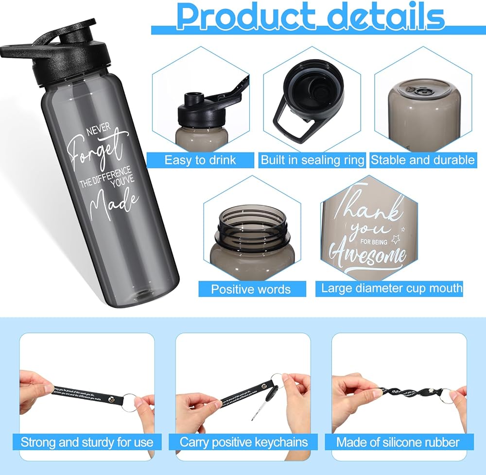 • Distinctive Design with a Message: the 24 oz water bottles and keychains reflect a strong theme of gratitude and motivation; The design is not only visually appealing but the messages will serve as a constant reminder of your appreciation; This will ensure your gift's intent is clear, and the receiver will always remember their value