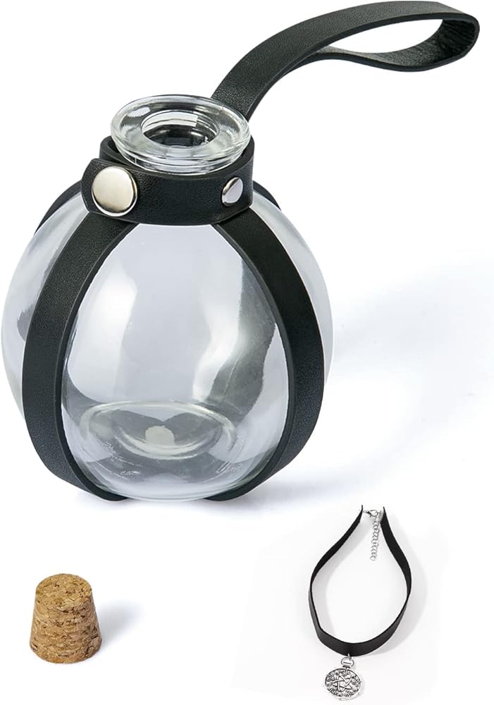 【Potion Bottles Halloween Decor Package List】250 ml clear glass potion bottle, a medieval leather belt,cool witch wizard costume necklace.