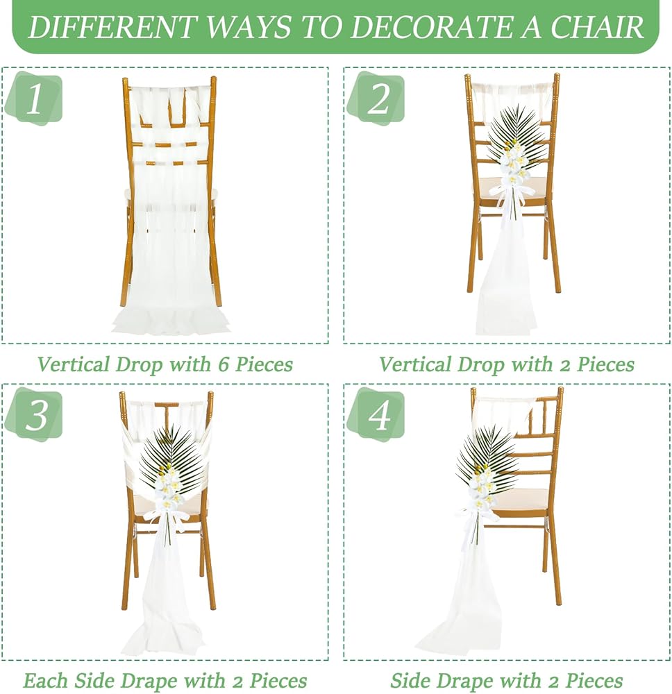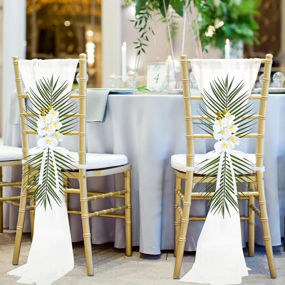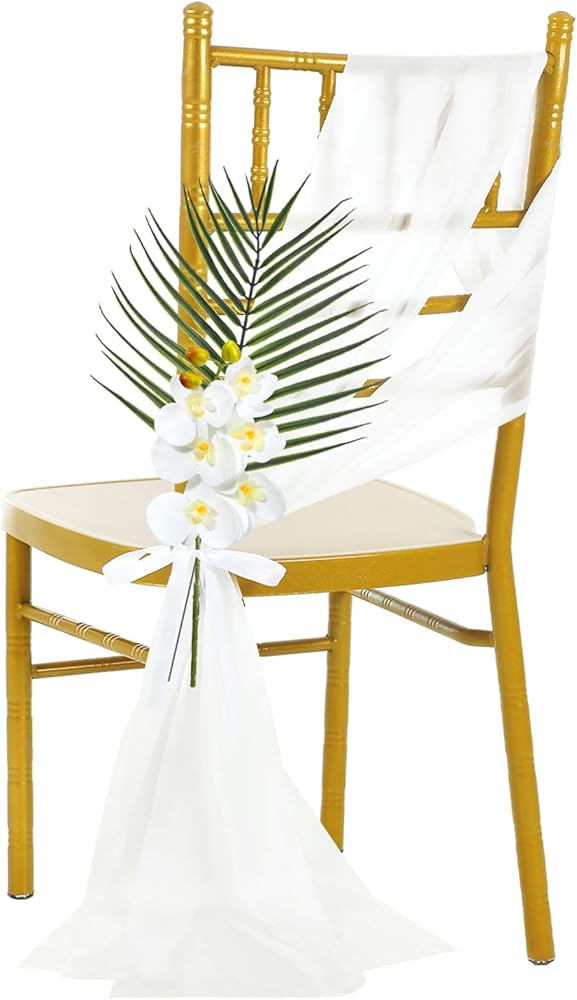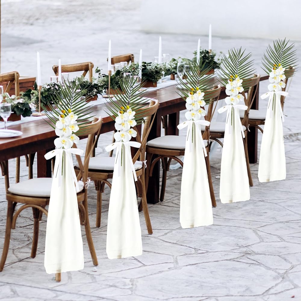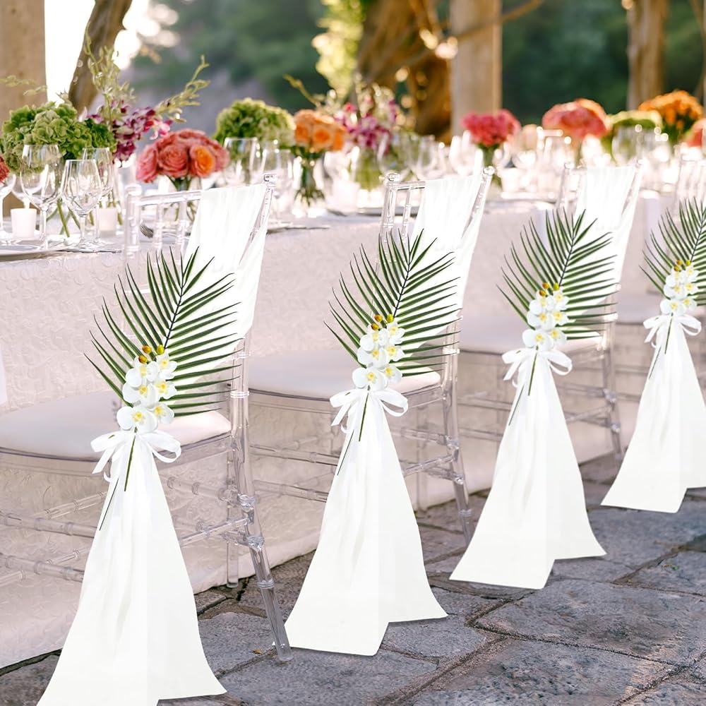 • Quality Material: our aisle chair covers are made from elegant chiffon, giving a soft and matte look; Additionally, our ribbons are made of polyester, providing durability and strength; Lastly, our artificial orchid stems and palm leaves are created with plastic material that remains fresh and vibrant for a very long time