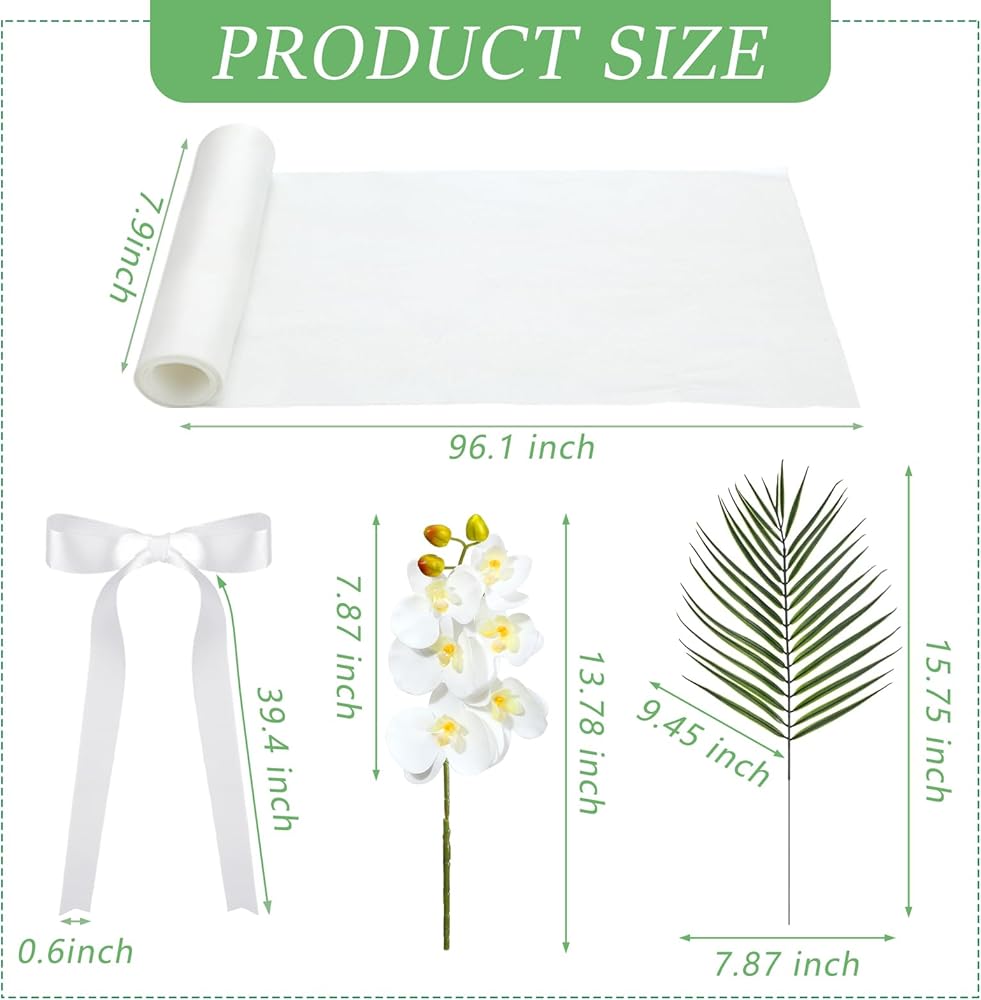 • Wedding Aisle Decorations: you will receive 12 chair sashes, 24 ribbons, 12 artificial orchid stems, and 12 artificial palm leaves, enough quantity and exquisite style to meet your wedding chair decoration needs