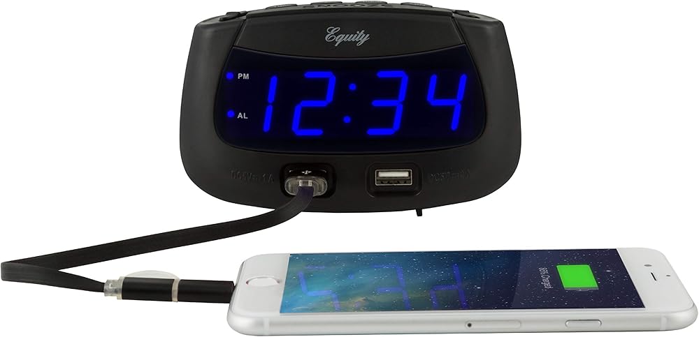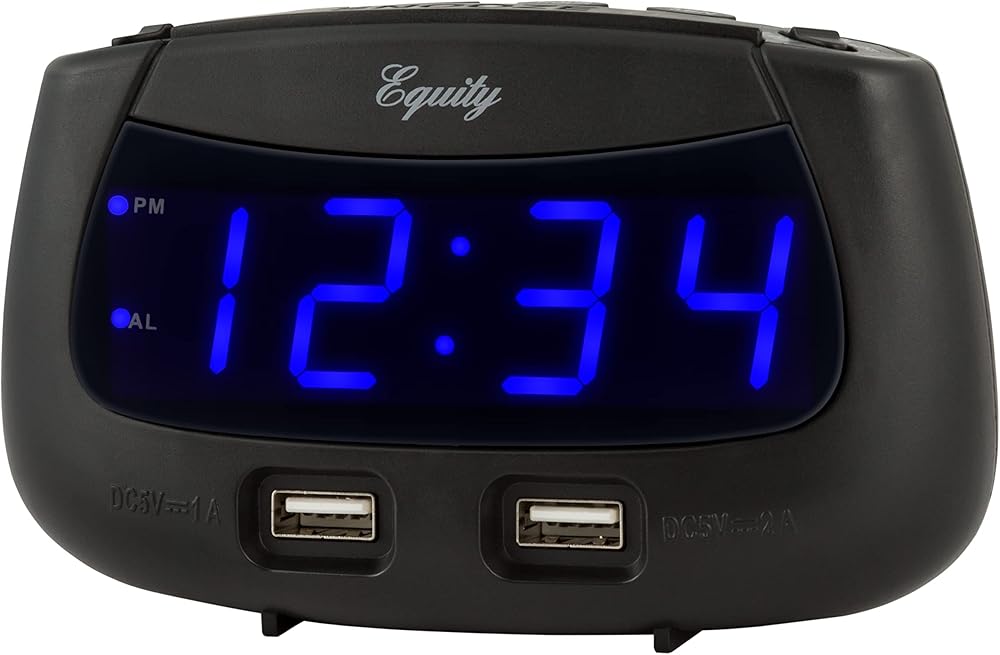 The ever-reliable Equity Digital Alarm Clock will get you going for the day. This alarm features bold 0.90-inch time digits in blue with a programmable alarm. This wonderful bedside timepiece helps you get a head start on your day with beep alarm sound and 8-minute snooze duration, in case you may need an extra few minutes. This Equity alarm clock is dependable and keeps time even if a storm approaches and you lose power. Charge up to two devices with dual USB ports. With a battery back-up option (requires one 9V, not included) this clock ensures that even in the event of power interruptions, you will never miss a wake-up!