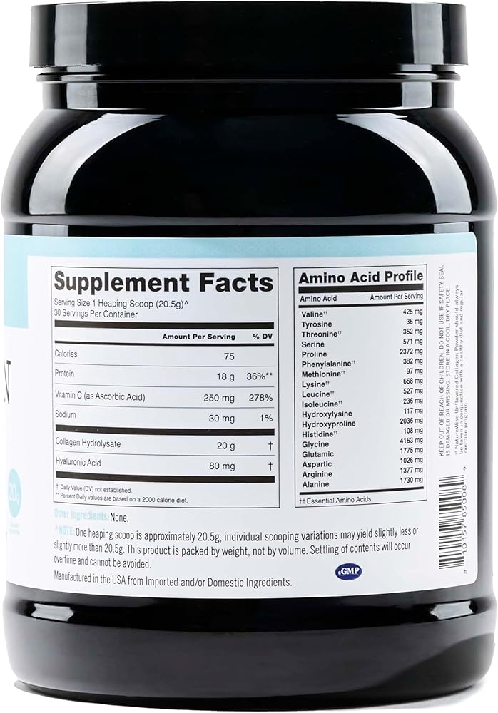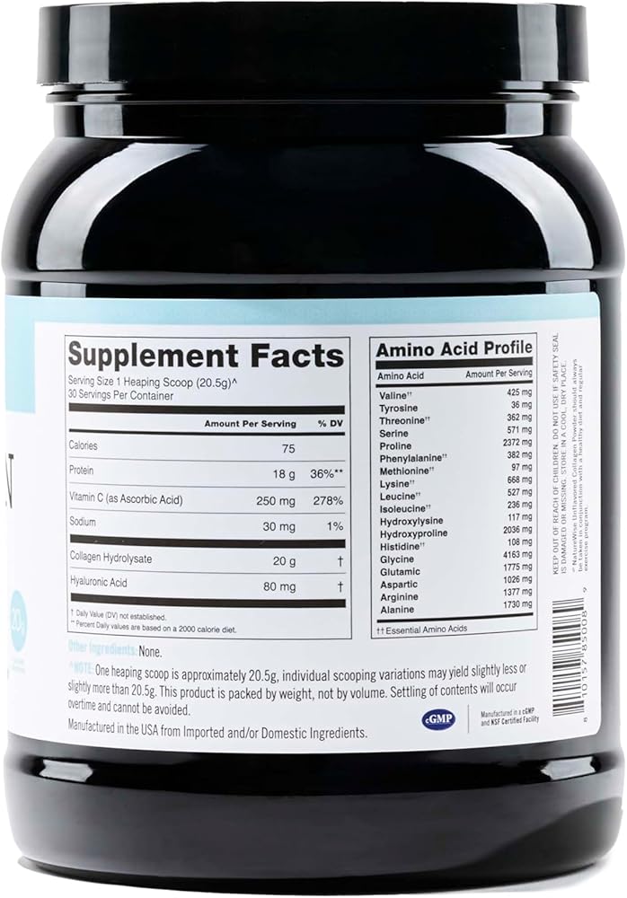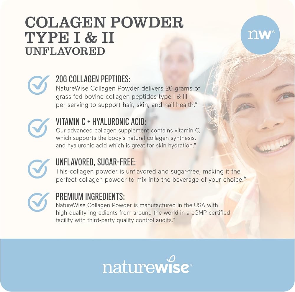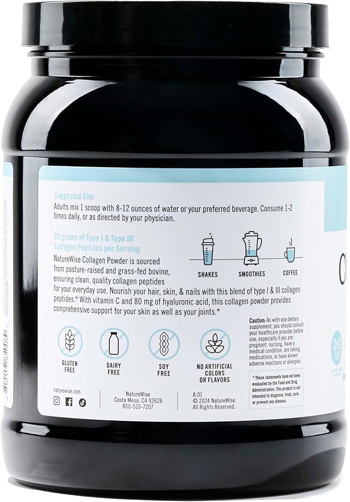 Collagen is an important component that makes up the skin, hair, nails, cartilage, joints, and bones. Taking a collagen supplement can help nourish your hair, skin, and nails.* You can also support your bone and cartilage health with dietary collagen since they are partly made of collagen. NatureWise Collagen Powder is an easy-to-dissolve formula that you can add to water, coffee, smoothies, and more. We left our collagen supplement unflavored so that it could be mixed into the liquid of your choice. And no need to worry about sugar content or soy, this collagen powder is a cleaner, simpler formula designed for daily use. Our collagen powder is made with hydrolyzed collagen peptides, or collagen that's been broken down into easily dissolvable amino acids for better absorption in the gut.* These collagen peptides have a balanced amino acids profile of 18 different amino acids to provide the building blocks of the body's protein (on top of its beauty benefits).* Every heaping scoop provides 20 grams of grass-fed bovine collagen peptides with type I & III for optimal hair, skin, and nail support.* We went beyond the standard collagen powder supplement and added vitamin C, an important antioxidant that helps the body produce collagen.* This collagen powder also contains hyaluronic acid, which is a substance that is naturally produced in the skin to maintain hydration.* Dietary hyaluronic acid may support the overall suppleness and appearance of your skin.* Implement this collagen powder into any drink of your choice to support your hair, skin, and nails, as well as your joints.* NatureWise Collagen Powder supplement does not include wheat, gluten, eggs, soy, milk, tree nuts, peanuts, or shellfish. *Statements regarding dietary supplements have not been evaluated by the FDA and are not intended to diagnose, treat, cure, or prevent any disease or health condition.