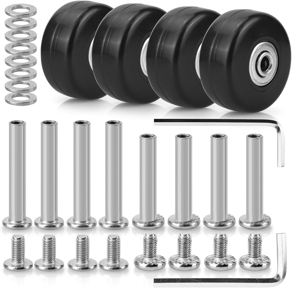 Package Includes: 4 x 50mm suitcase replacement wheels, 4 x 30mm wheel axles, 4 x 35mm wheel axles, 8 x Axles screws, 8 x Washers, 2 x Wrenches.