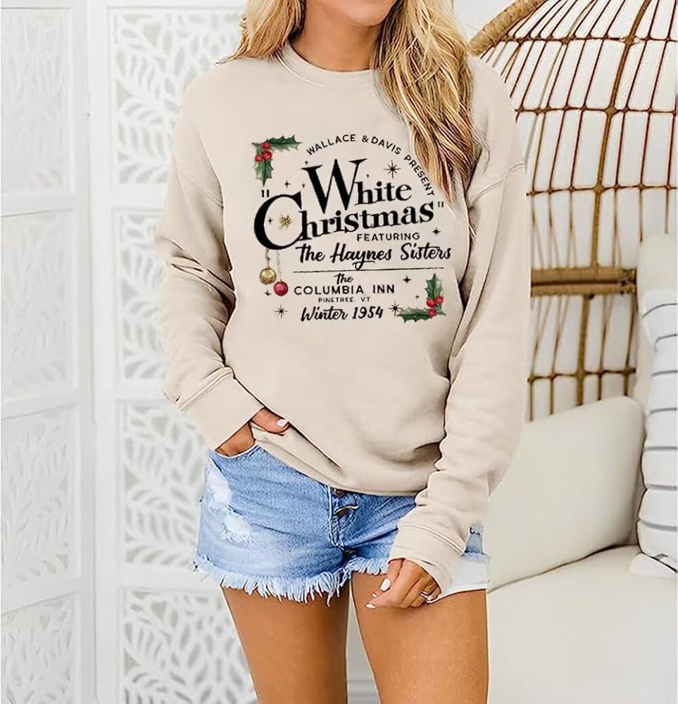 White Christmas Movie 1954 Sweatshirt Womens, Christmas Holiday Crewneck Pullover Shirt, Haynes Sisters Printed Long Sleeve Shirt.
