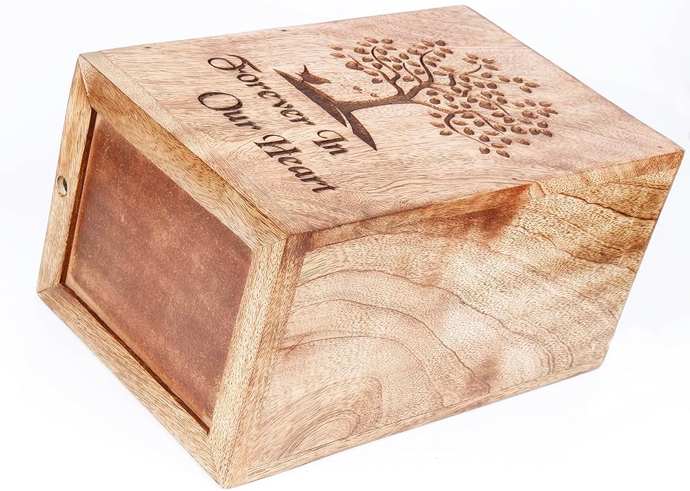 SUPERIOR QUALITY: Funeral Cremation Urn Box are made from HIGHEST QUALITY WOOD - Solid Wood (INDIAN SEASONAL WOOD) which is known for its optimum quality. This wood is golden brown to deep brown in color, with darker streaks that gives the wood an attractive appearance. The wood is strong with a uniform and medium course texture. It has a good natural resistance to decay and is considered to be a popular carving and engraving wood in India.