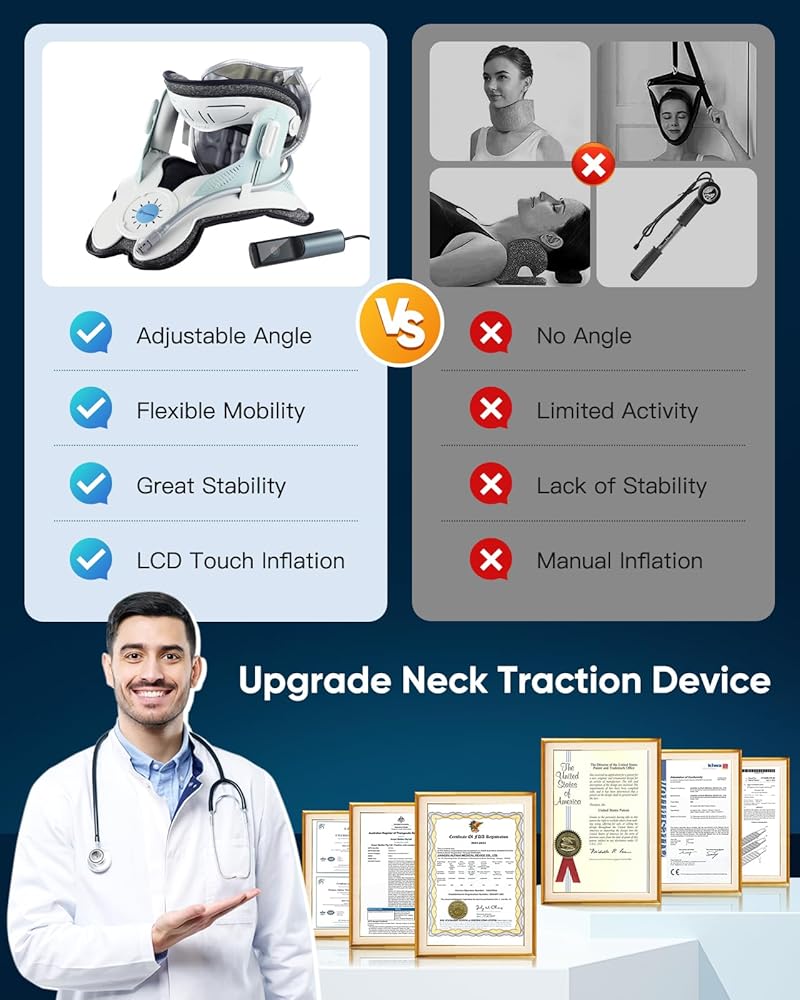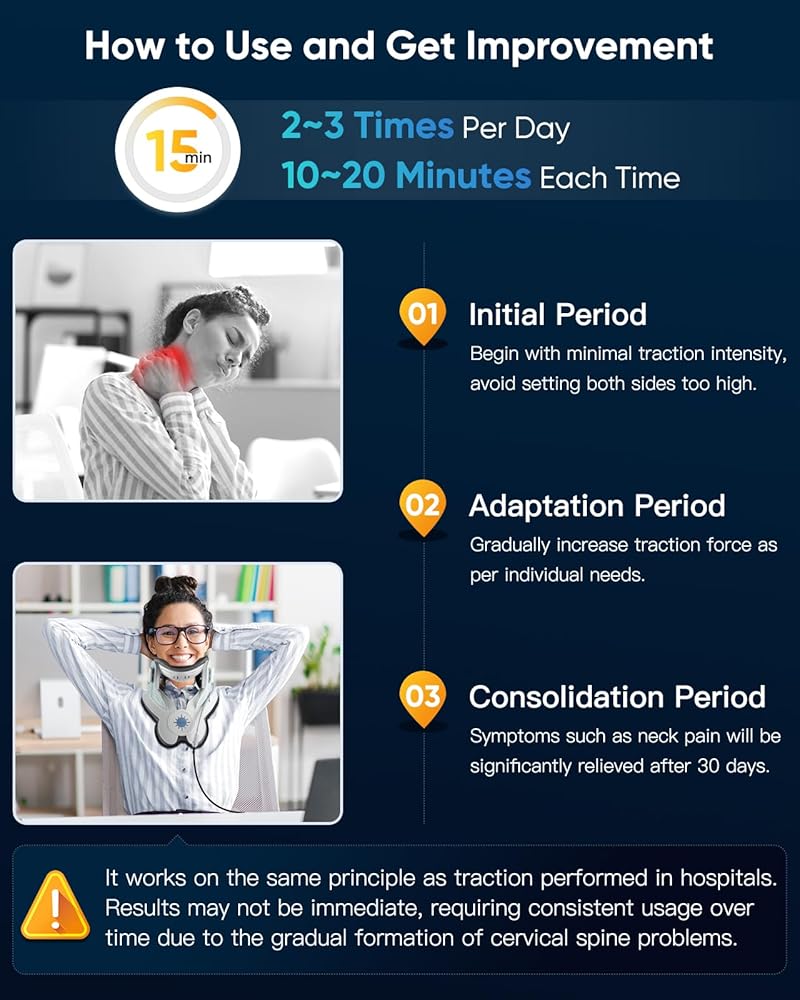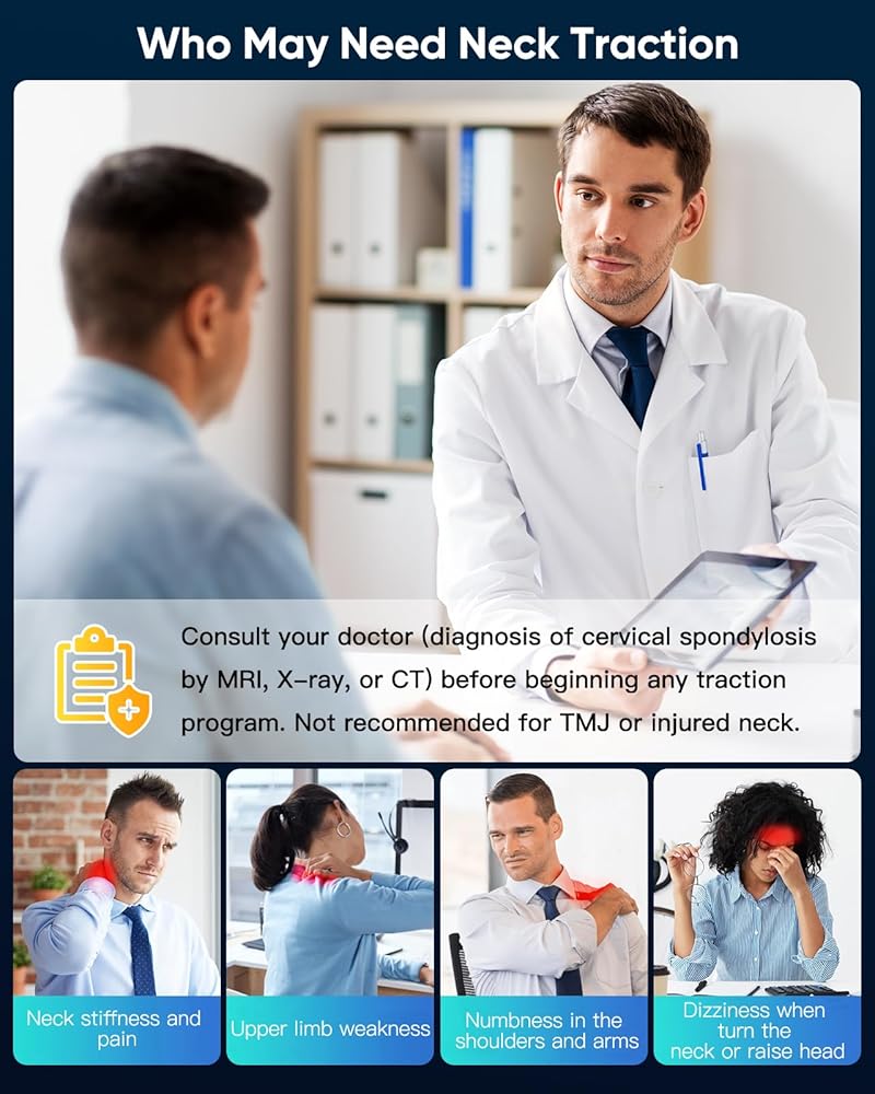【يوصى بالجهاز من قبل الأطباء】يوصى بهذا الجهاز للأفراد الذين يعانون من مشكلات متعلقة بالعمود الفقري العنقي، بما في ذلك داء الفقار العنقي الذي يتم تشخيصه من خلال التصوير بالرنين المغناطيسي أو الأشعة السينية أو الأشعة المقطعية، أو ألم ضغط العمود الفقري العنقي طويل الأمد، أو تنميل الكتف والذراع، أو الدوخة الدورانية أو الأحاسيس السمعية واحتياجات الجر لقمات العمود الفقري العنقي دون تثبيت.