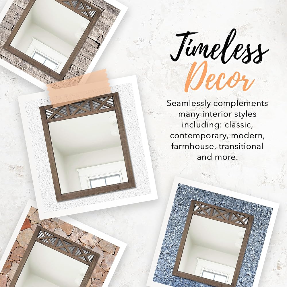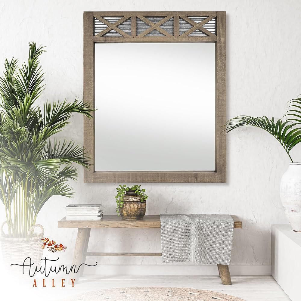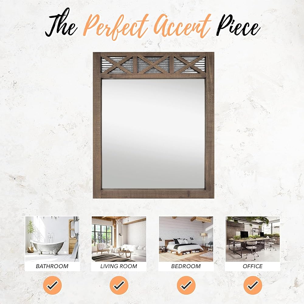 مرآة فانيتي بإطار بباب المزرعة ريفي - تحقق من شعرك أو مكياجك في الصباح بأجواء مريحة ومريحة. يبلغ عرض مرآة الحائط الصغيرة هذه ذات الحجم الخريفي 20 بوصة وطولها 28 بوصة، وتمنح مساحتك فخامة مرغوبة. تُعد مرآة باب الحظيرة الريفية هذه قطعة لافتة للنظر من ديكور الحائط الريفي الذي يمكنك تعليقها في غرفة المعيشة أو غرفة النوم أو المدخل. يمكنك أيضًا استخدامها كمرآة في غرفة المكياج أو غرفة البودرة أو منضدة الحمام للحصول على مظهر صناعي أنيق
