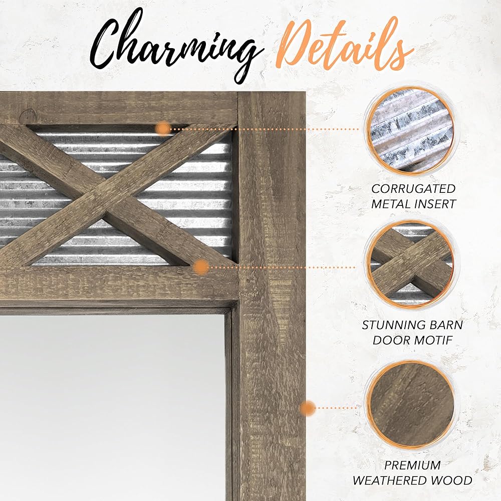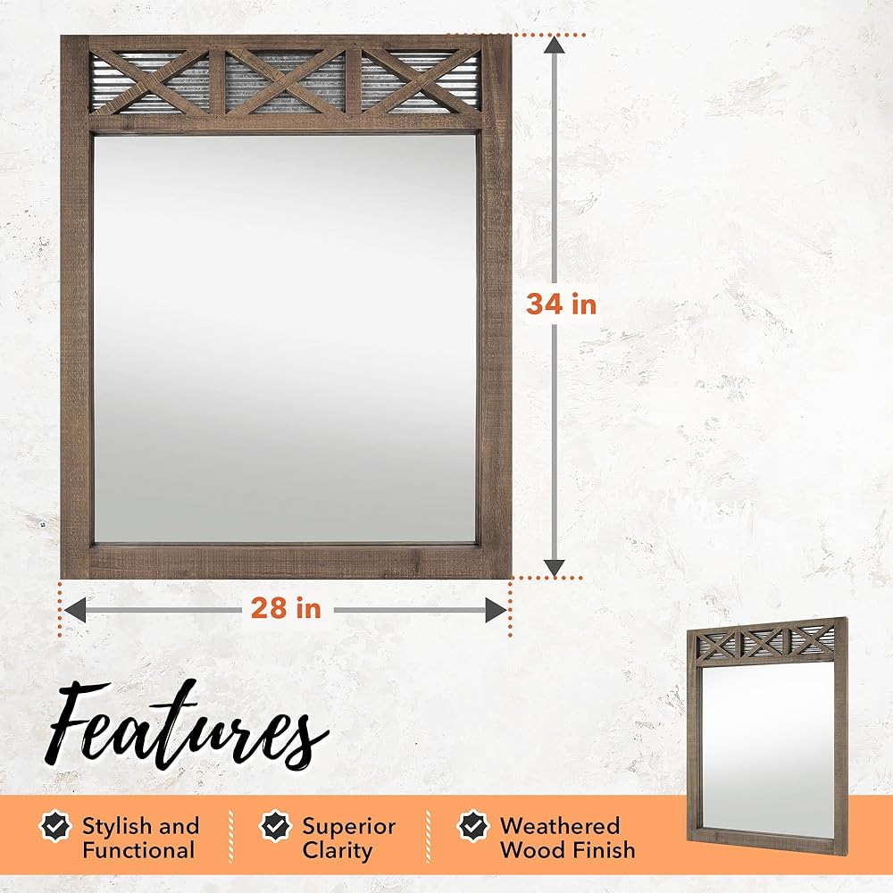 جودة رائعة ومتينة - مرايا الحمام المثبتة على الحائط هذه مصنوعة لتدوم طويلاً، ولها إطار خشبي تم إضفاء لمسة من السحر الريفي عليه. تم تصميم مرآة باب الحظيرة هذه بخبرة لتدوم لفترة طويلة؛ من غير المرجح أن يتشقق الإطار أو ينكسر.