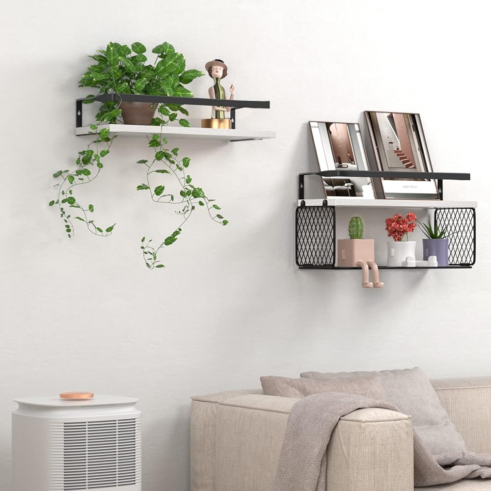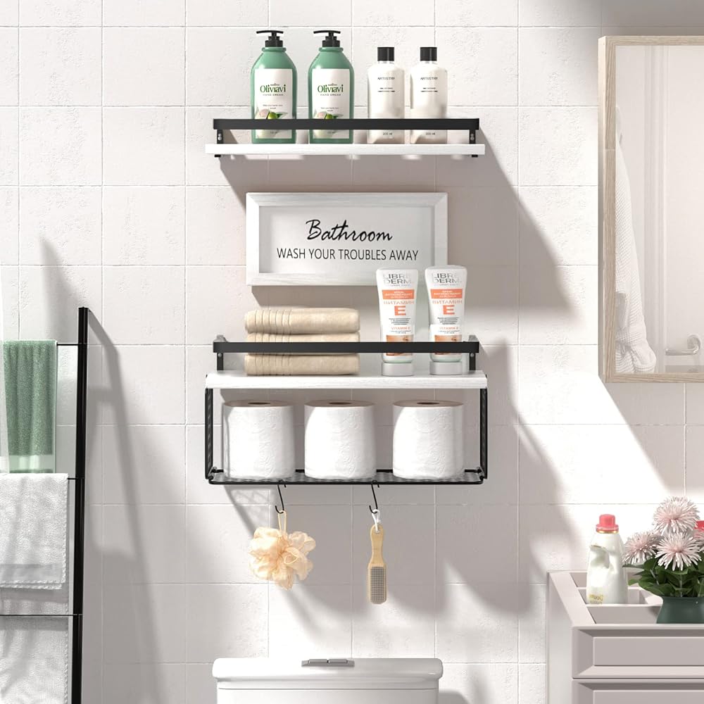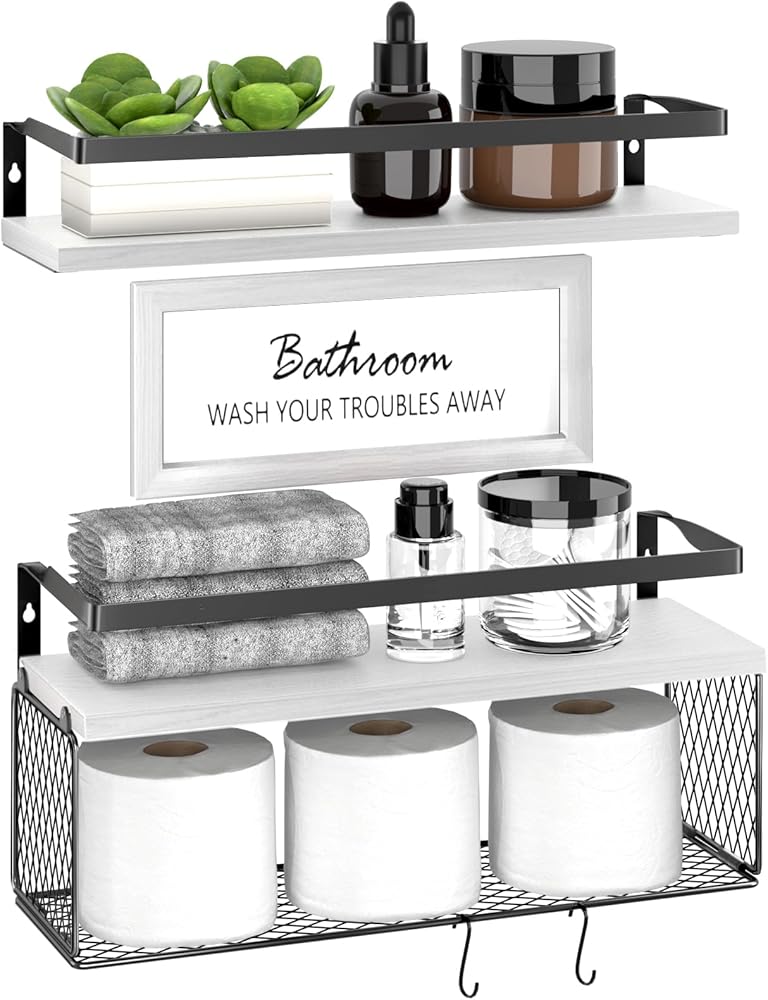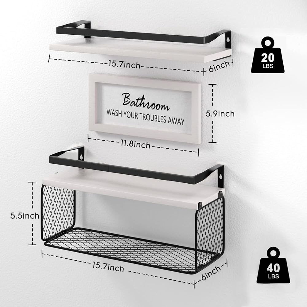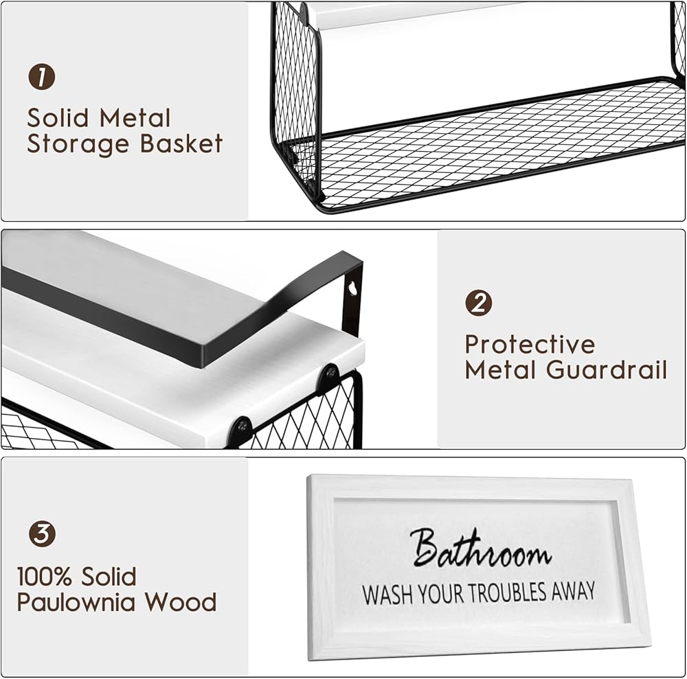 [أرفف عائمة مع سلة ورق المرحاض وخطافات] - حجم سلة الأرفف العائمة للحمام هو 16*6*5.5 بوصة، والتي يمكنها تخزين 3 لفات من ورق المرحاض والأشياء الصغيرة الأخرى والمناشف. سلة التخزين الخاصة بنا من أرفف الحمام العائمة مصنوعة من سلك حديد مع لمسة نهائية مطلية بالمسحوق، وهي أكثر متانة ولن تصدأ. يناسب البيئة الرطبة. هذه الأرفف العائمة المثبتة على الحائط بتصميم شبكي ستقلل من تراكم الغبار وتحافظ على ورق التواليت نظيفًا وجافًا.